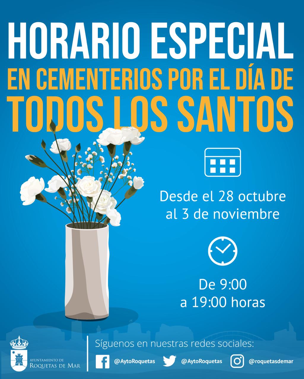 El Ayuntamiento de Roquetas de Mar, a través del área de Medio Ambiente, Salud y Consumo, ha puesto en marcha el dispositivo especial con motivo de la festividad de Todos los Santos, que incluye la ampliación del horario de apertura de los cementerios municipales.