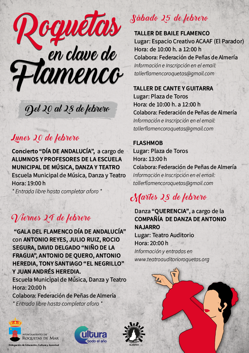 El sábado, 25 de febrero de 10 a 12 horas tendrá lugar un taller de baile flamenco en el Espacio Creativo ACAAF en El Parador. En esta actividad colabora la Federación de peñas de Almería. También de 10 a 12 horas en la Plaza de Toros de Roquetas de Mar tendrá lugar un taller de cante y guitarra en el que también colabora la Federación de Peñas de Almería. Ese mismo día a las 13 horas en la Plaza de Toros de Roquetas tendrá lugar un flashmob. Actividad en la que colabora la Federación de Peñas de Almería.