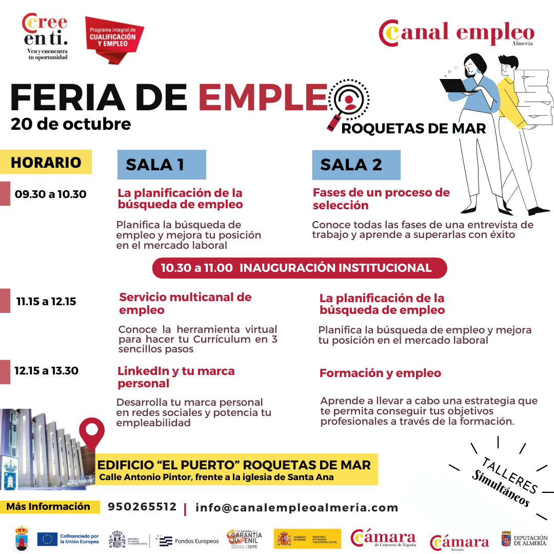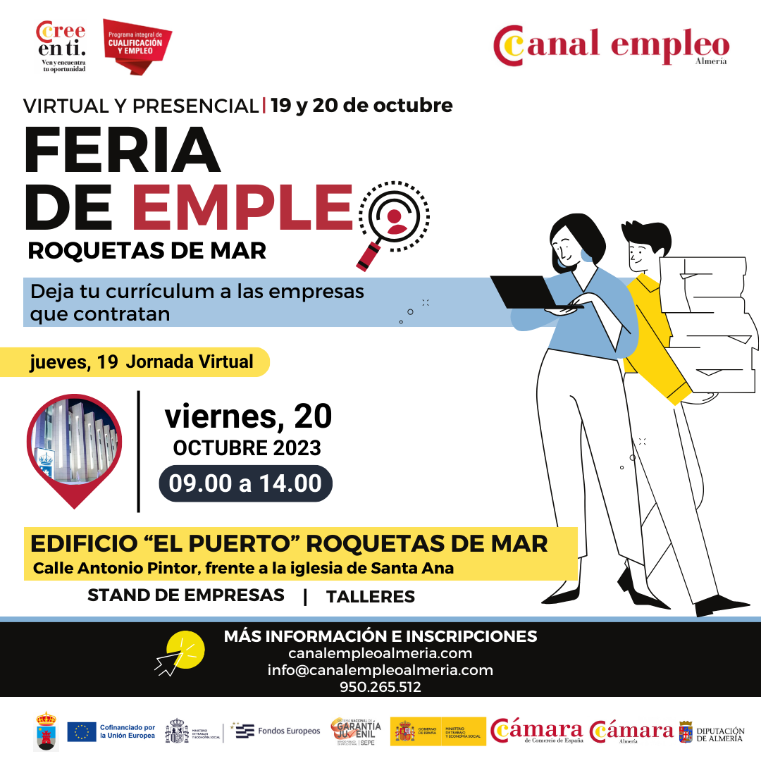 El Ayuntamiento de Roquetas de Mar, en colaboración con la Cámara de Comercio de Almería y la Diputación de Almería, organizan la Feria de Empleo que se llevará a cabo los días 19 y 20 de octubre en modalidades virtual y presencial respectivamente.