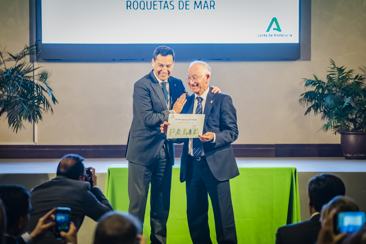 El alcalde, Gabriel Amat, ha recibido de manos del presidente de la Junta de Andalucía, Juanma Moreno, el diploma por la Mención Honorífica que acredita el reconocimiento municipal por contener la presencia de algas invasoras en las playas del litoral, a la par que regenera sus playas gracias a la arena que se criba de la recogida de este material vegetal