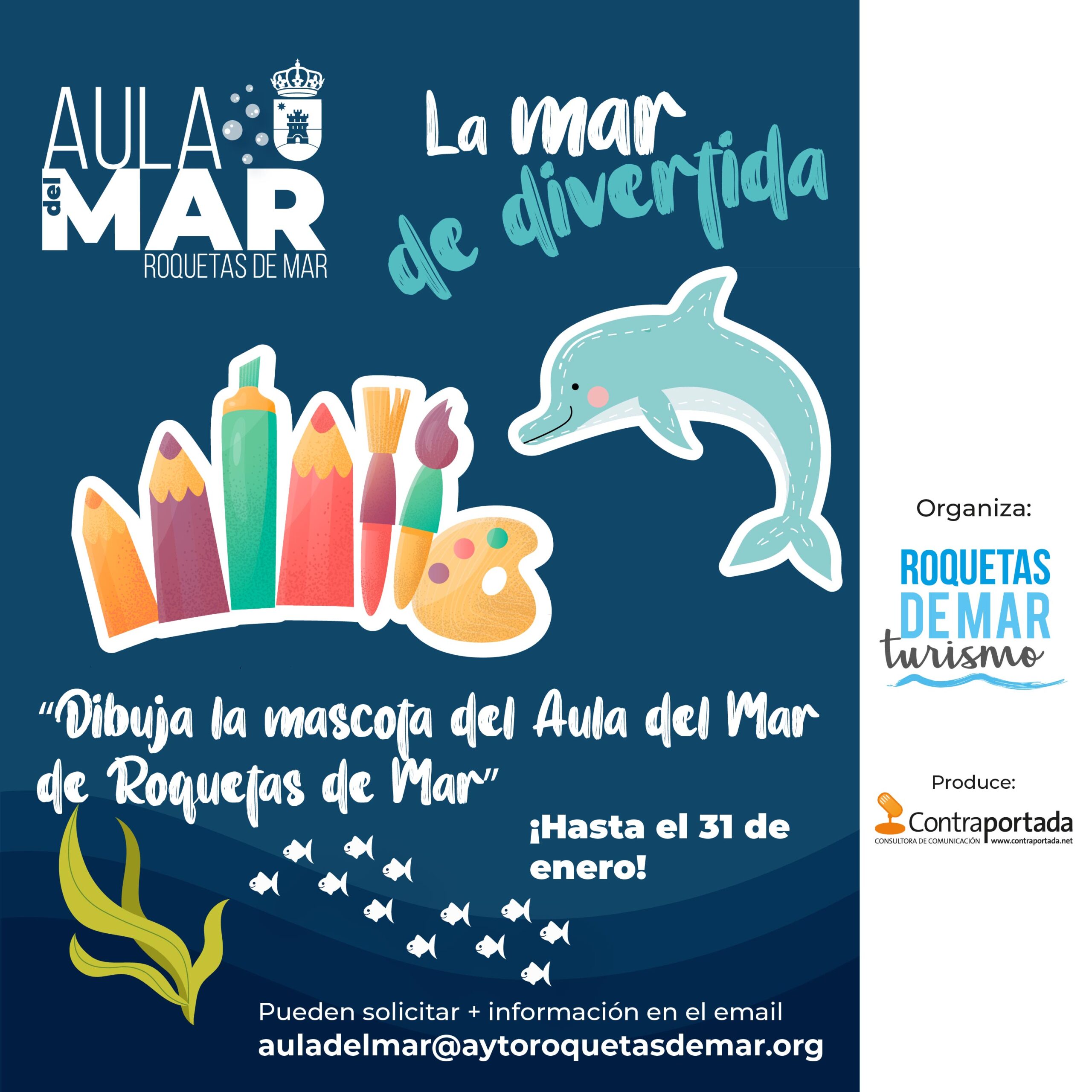 El concurso para dibujar la mascota del Aula del Mar está abierto, como se ha mencionado, hasta el 31 de enero. Los participantes deberán dibujar una mascota que represente al Aula del Mar y puede participar el alumnado de los centros de enseñanza de Educación Primaria y Secundaria del municipio de Roquetas de Mar. El Ayuntamiento quiere que sea una actividad familiar, por lo que los estudiantes pueden ser ayudados por sus padres, hermanos/as y familiares en la realización del dibujo.