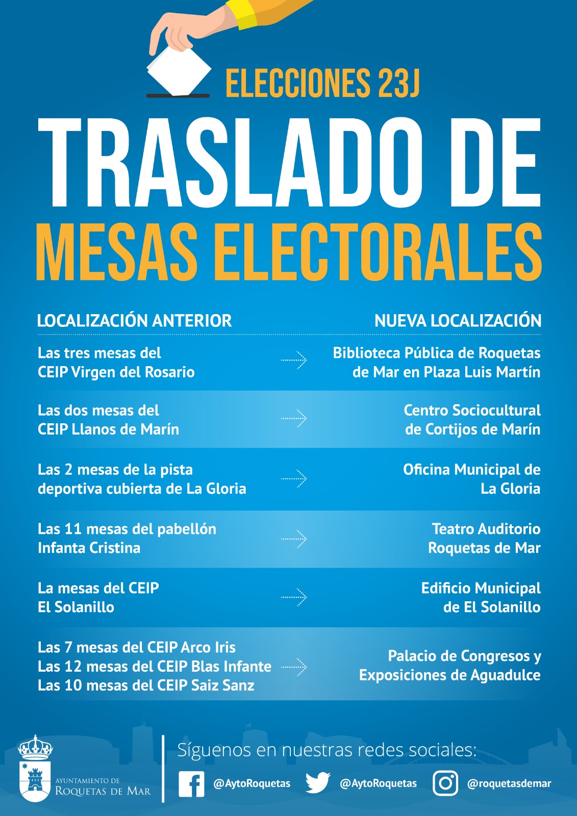 La Biblioteca Municipal de Roquetas de Mar, ubicada en la Plaza Luis Martín, acogerá las tres mesas ubicadas en el C.E.I.P Virgen del Rosario. Las dos mesas que tradicionalmente se han ubicado en el C.E.I.P Llanos de María se trasladan al Centro Socioculturalde Cortijos de Marín.
