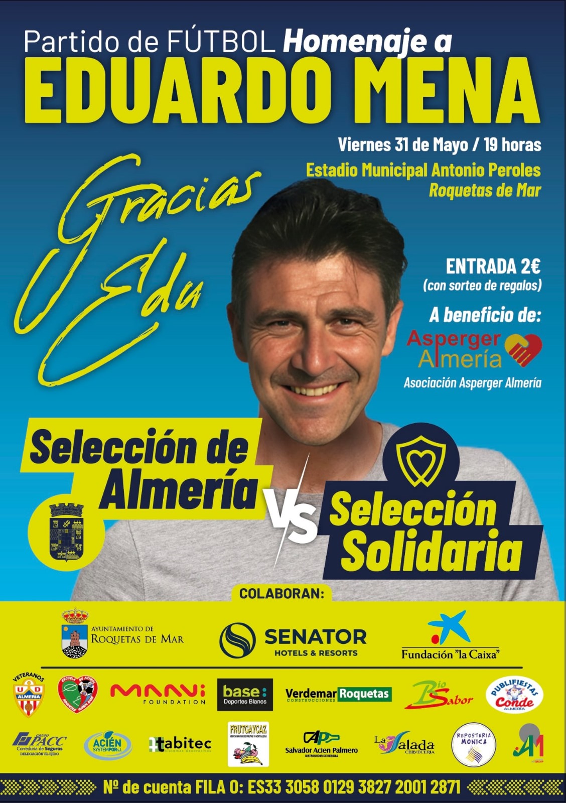 El alcalde de Roquetas de Mar, Gabriel Amat, ha puesto en valor la calidad humana de Eduardo Mena y la importancia de recordar su legado ya que su prioridad “era siempre trabajar y ayudar a los demás”. “Animo a todos los roqueteros y a los almerienses a que colaboren con esta causa solidaria a beneficio de Asperger Almería con la que se pretende colaborar con este colectivo y, al mismo tiempo, dar un sentido homenaje a un roquetero de adopción con la celebración de este partido de futbol que será disfrutado también por muchos aficionados”.