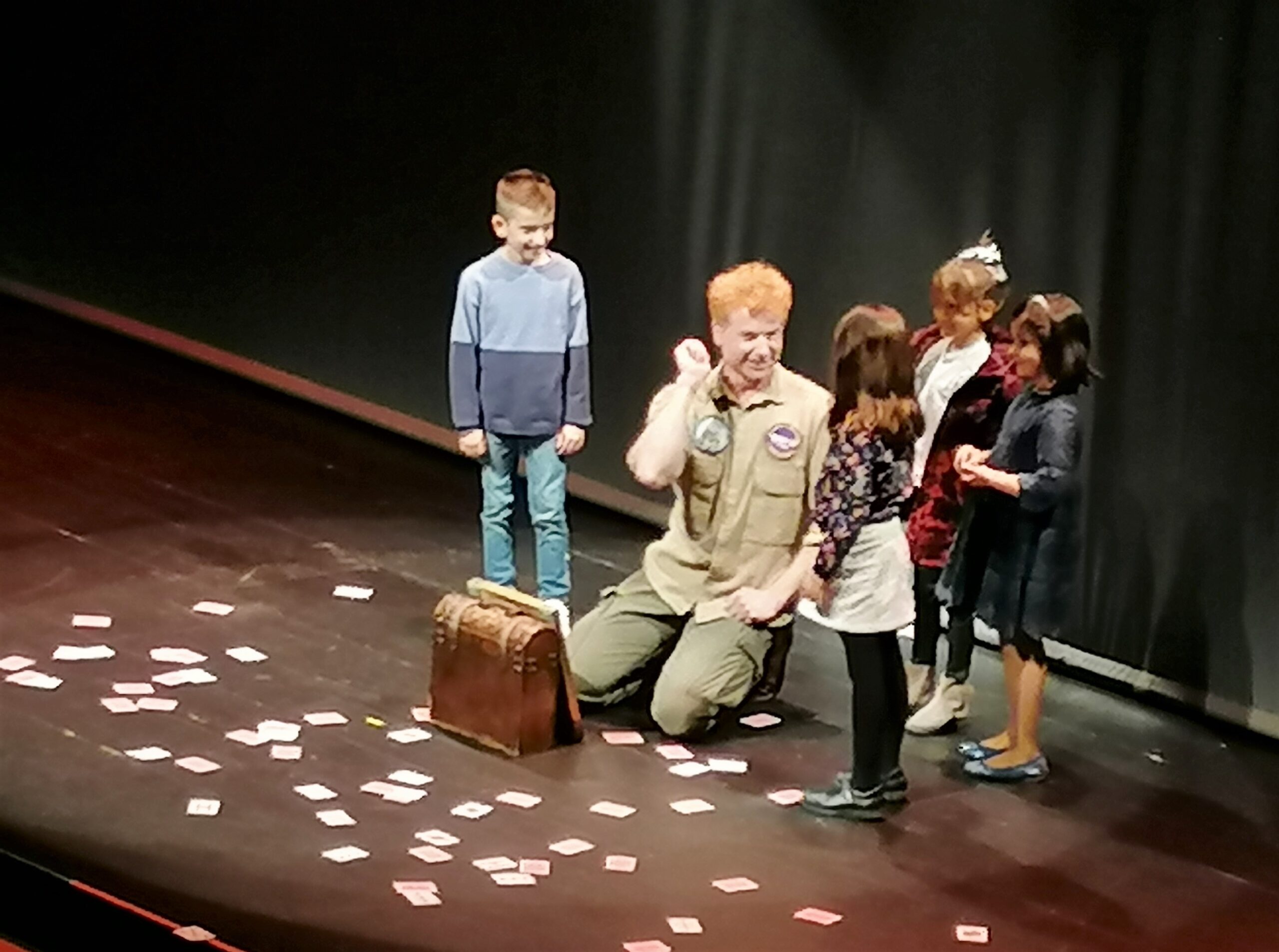 El inicio ya es sorprendente. Mago Yunke baja la escalera del patio de butacas, mientras todos lo esperan por el escenario. “Mi nombre es Yunque y con este espectáculo me quiero trasladar a mi infancia. Con siete y ocho años mi padre me llevó al circo y me impactó mucho un señor que era mago y tiraba cuchillos”. Lo primero que realizó fue elegir a una persona del publico y realiza un juego con la baraja de póker.