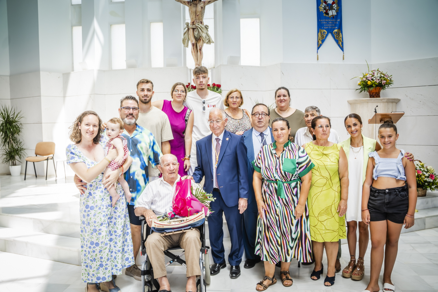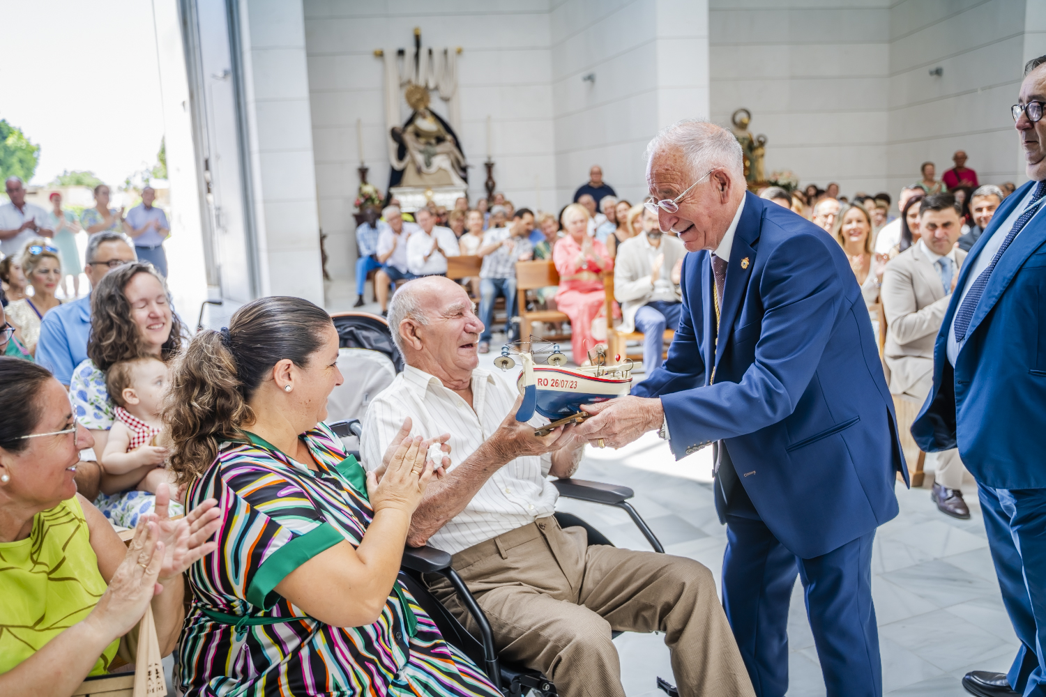 El alcalde de Roquetas de Mar, Gabriel Amat, junto con el concejal de Deportes y Tiempo Libre, José Juan Rubí, ha entregado el “tradicional barco pesquero” a Francisco Muñoz Alcaraz más conocido como “El Pistolo”. Se trata de un reconocimiento que se lleva a cabo durante la celebración de la misa dedicada a los abuelos con motivo de las Fiestas de Santa Ana que, hoy miércoles 26 de julio, finalizan con la procesión marítima-terrestre de las patronas y el tradicional lavado de cara a Santa Ana.