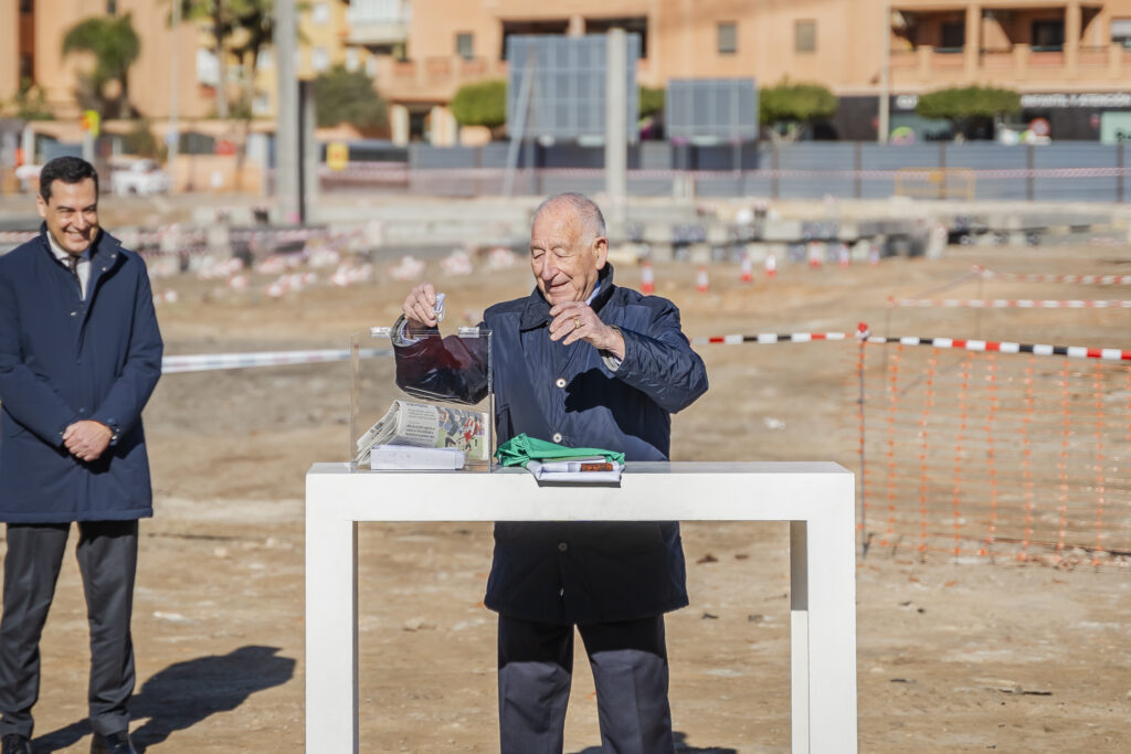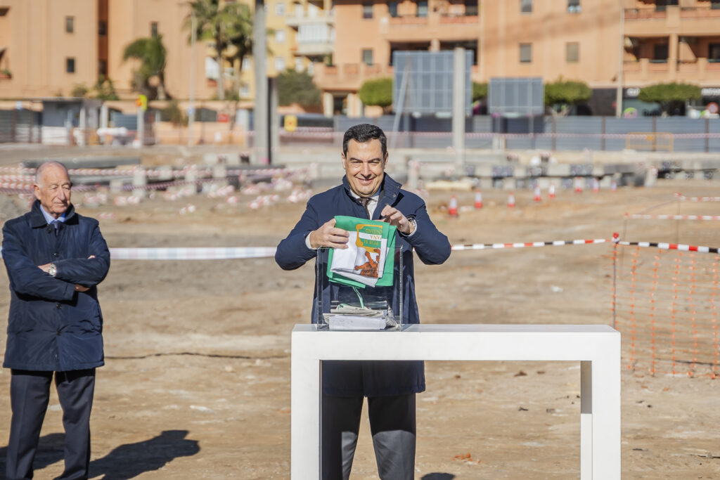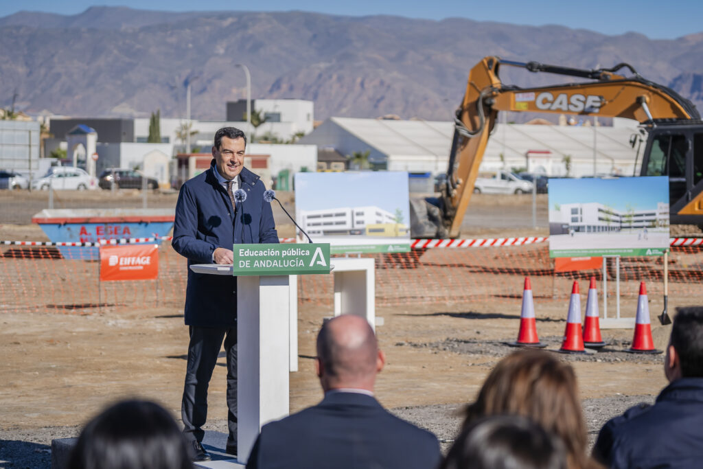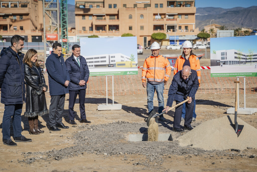 El presidente de la Junta de Andalucía, Juan Moreno, ha asistido al acto de colocación de primera piedra del Instituto de Enseñanza Secundaria de Las Salinas de Roquetas de Mar, un centro amplio, moderno, eficiente, con más de 600 plazas para alumnado de ESO y Bachillerato, que ha contado con una inversión cercana a los 10 millones de euros y que tendrá muy en cuenta la accesibilidad plena, la bioclimatización y el ahorro energético mediante placas solares.