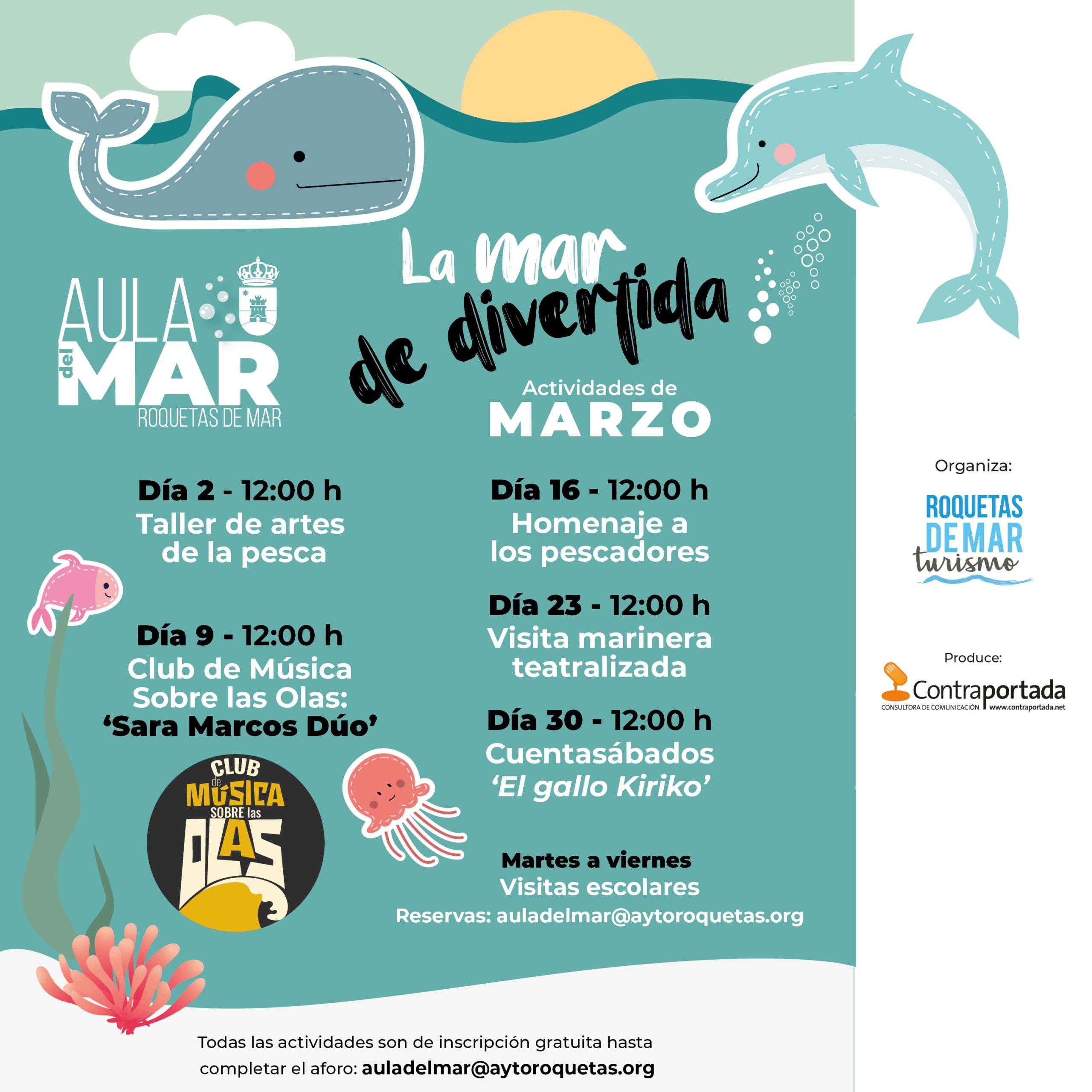 El programa ‘La mar de divertida’ tiene la inscripción gratuita hasta completar el aforo, que se debe solicitar en el email auladelmar@aytoroquetas.org. La siguiente actividad será el sábado, 9 de marzo, a las 12 horas, donde se ofrecerá una nueva sesión de jazz el Club de Música ‘Sobre las Olas’ del Aula del Mar, en este caso a cargo de Sara Marcos Dúo. El sábado, 16 de marzo, a las 12 horas, se vivirá un momento muy especial. El Aula del Mar quiere rendir un sentido homenaje a los pescadores de Roquetas de Mar que generan desarrollo económico, cuidan el medio ambiente, conservan las tradiciones y alimentan de forma saludable al municipio. El sábado, 23 de marzo, se celebrará una visita marinera teatralizada, que saldrá desde el Faro, y recorrerá el Castillo de Santa Ana, Puerto y el Aula del Mar, y el sábado, 30 de marzo, regresarán los cuentasábados, con la historia del ‘Gallo Kiriko’, un divertido animal que vive en una granja y al que le suceden aventuras muy divertidas.
