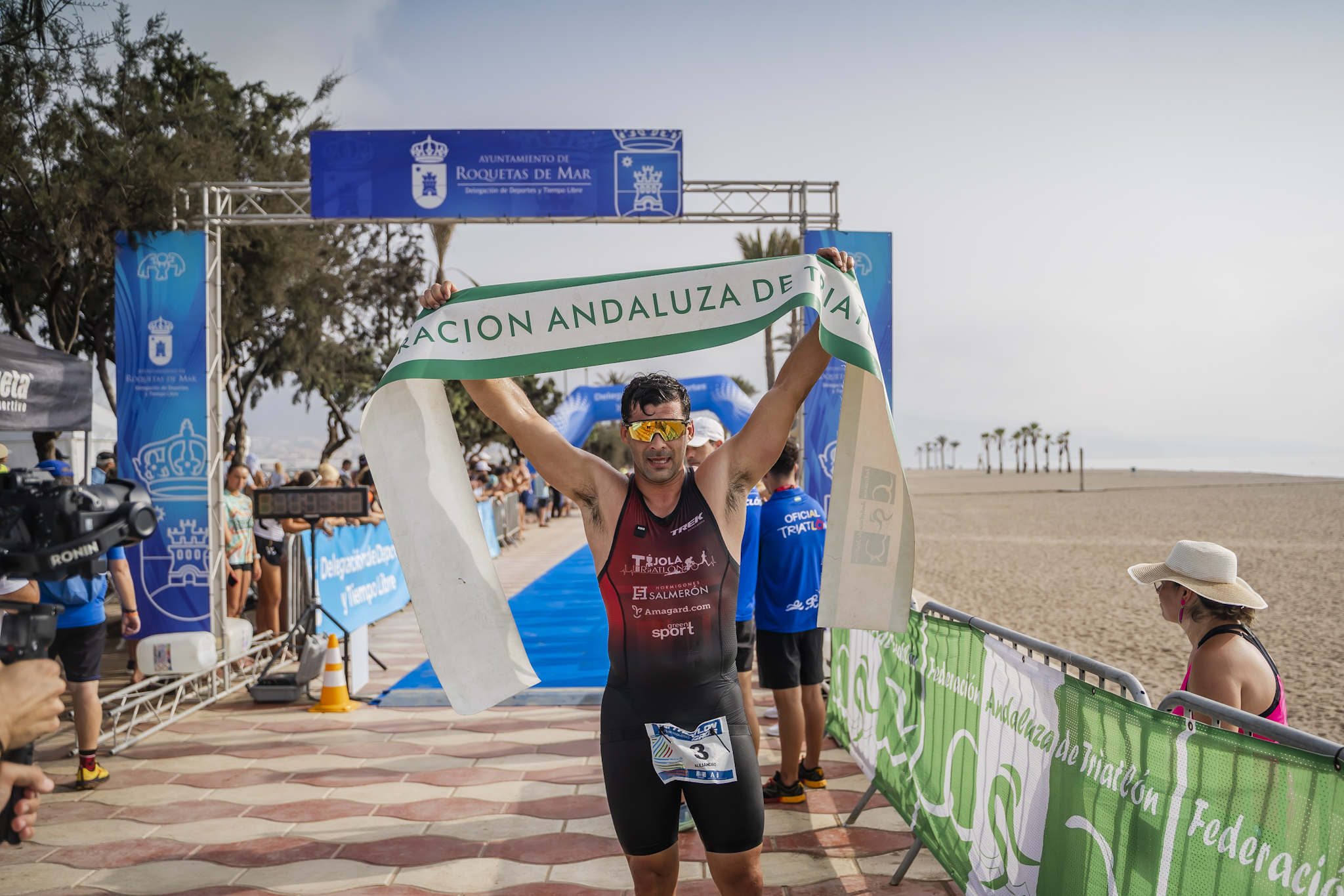 Alejandro Salmerón y Sonia Vázquez se han proclamado vencedores de la categoría absoluta en el VIII Triatlón Cros Ciudad de Roquetas, celebrado durante la mañana de hoy y que ha contado con la participación de un total de 150 deportistas. La prueba se desarrolló en el entorno natural de Las Salinas bajo un clima espectacular, lo que contribuyó al éxito del evento. En la categoría masculina, Germán Rodríguez y Miguel Ángel Benítez completaron el podio, mientras que, en la femenina, Estíbaliz Plaza y Laura Fernández acompañaron a Vázquez en los primeros puestos.