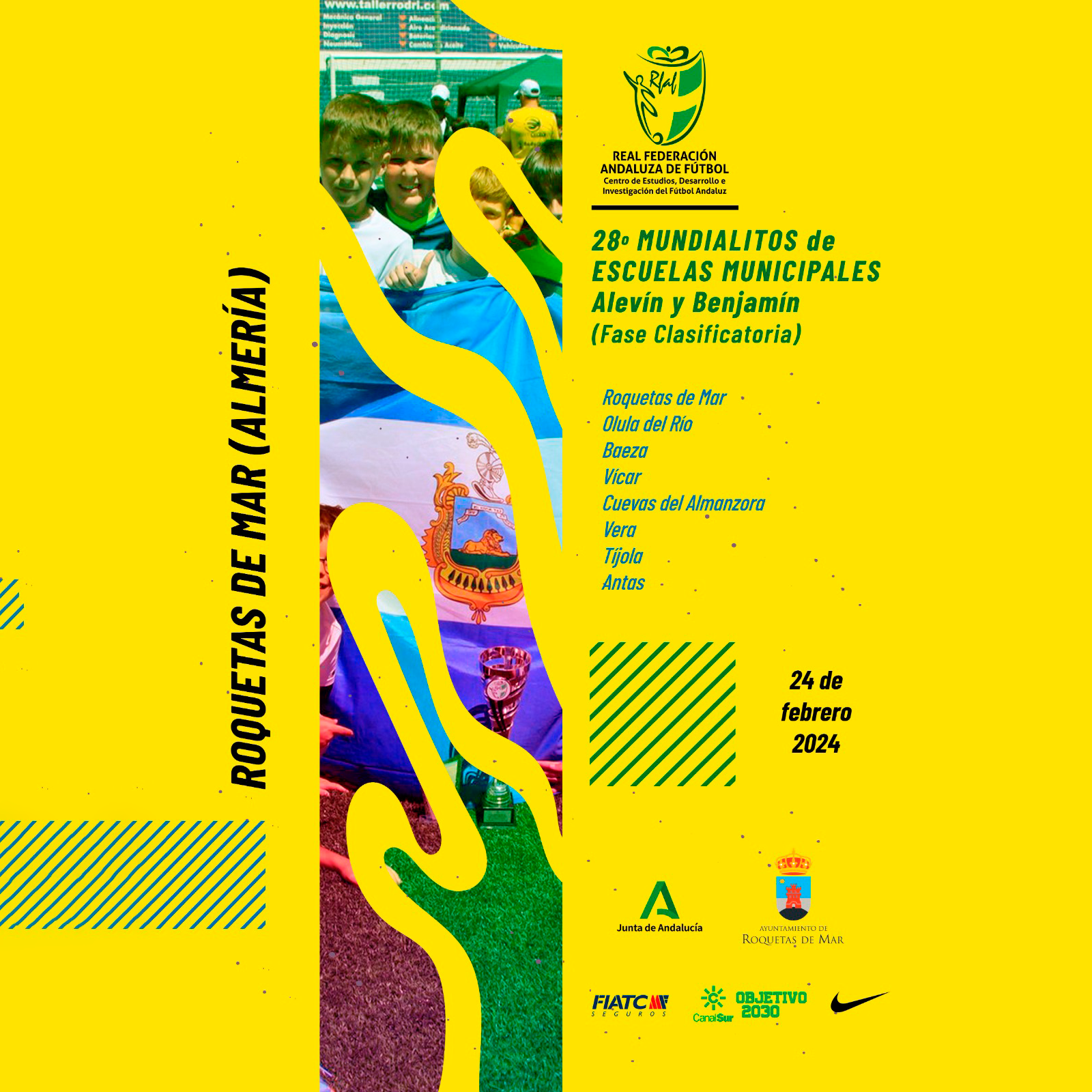En el mundialito participarán ocho escuelas de fútbol de categoría benjamín y 8 en categoría alevín, en concreto, Roquetas de Mar, Cuevas del Almanzora, Vera, Vícar, Olula del Río, Antas, Tíjola de la provincia de Almería y Baeza de la provincia de Jaén.