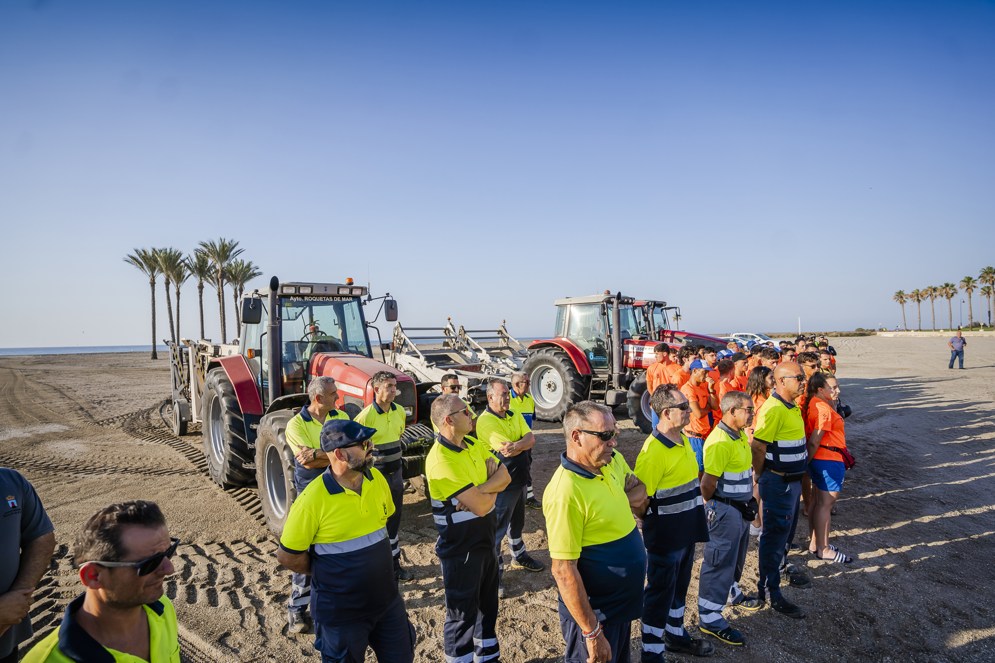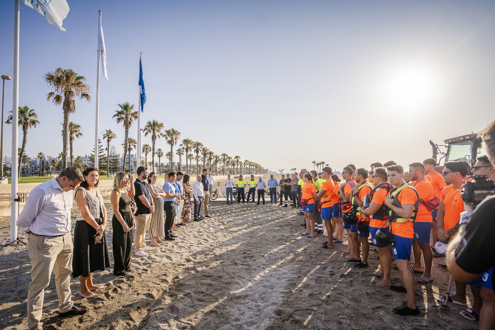 El alcalde de Roquetas de Mar, Gabriel Amat, acompañado por todos los concejales del equipo de gobierno, junto con el delegado de Turismo, Cultura y Deportes de la Junta de Andalucía en Almería, Juan José Alonso, han participado en este acto en el que también han estado presentes agentes de Policía Local, operarios de playas y miembros de Protección Civil.