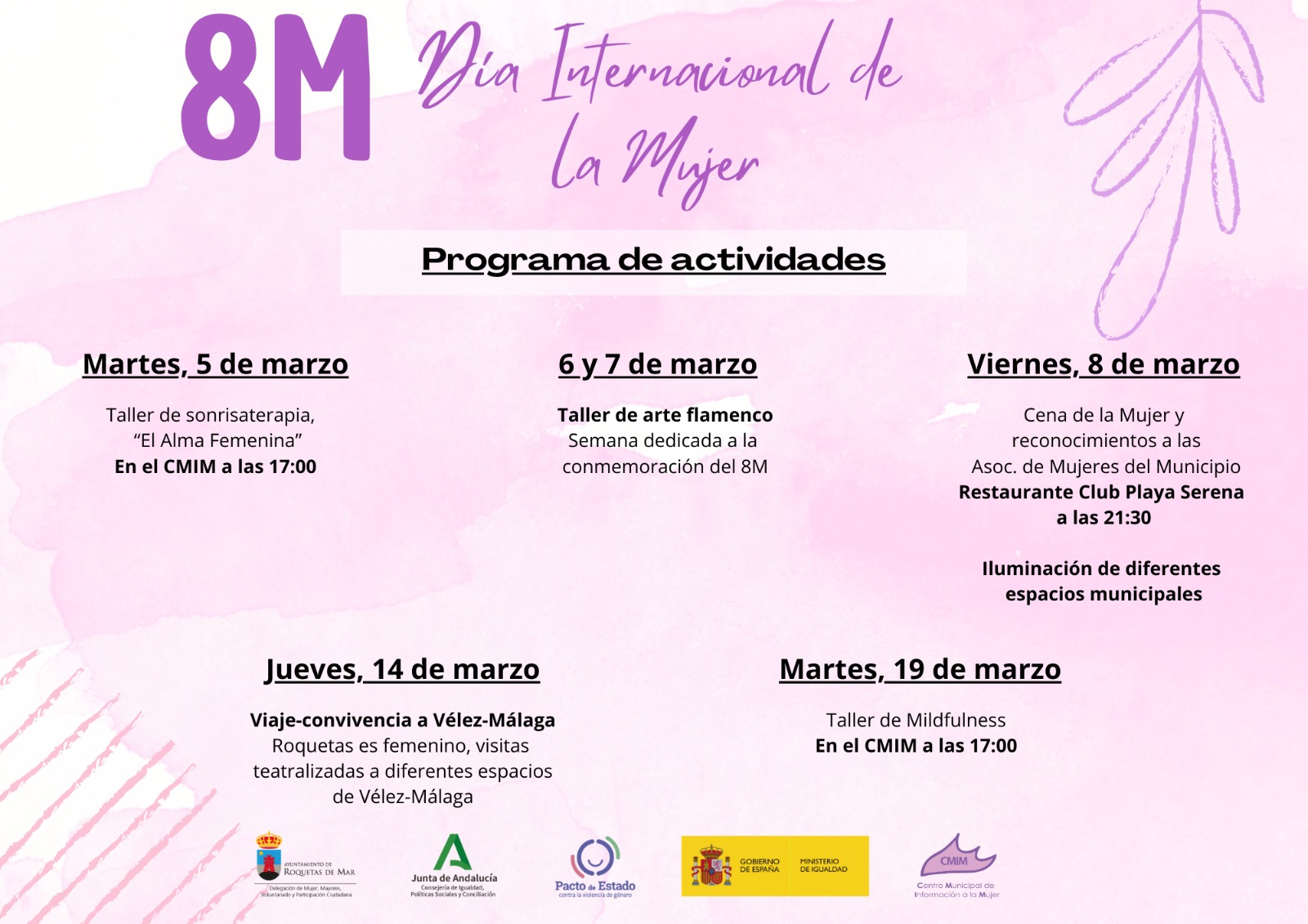 El Ayuntamiento de Roquetas de Mar, a través del área de la Mujer, ha organizado una amplia programación de actividades de cara al Día Internacional de la Mujer que se conmemora el próximo 8 de marzo.