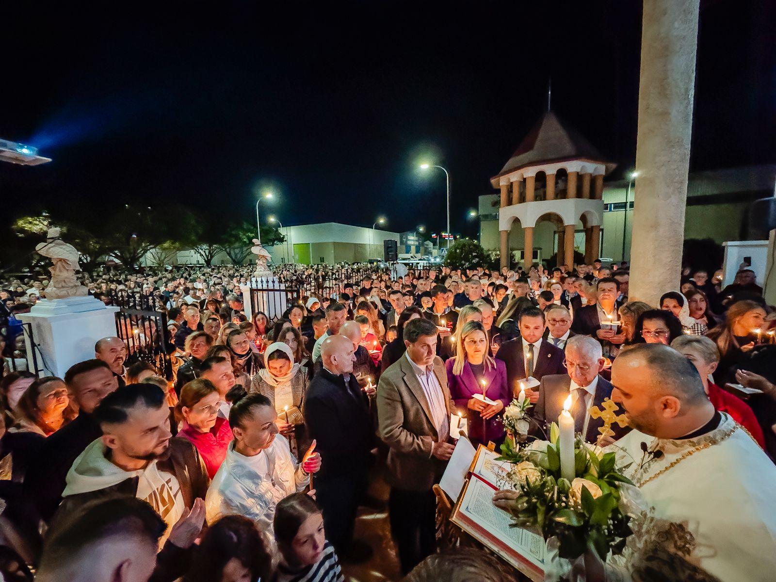 La tradición ortodoxa rumana dice que la liturgia comience con el templo a oscuras a las 12 de la noche del sábado, pero para coincidir con la hora de Rumanía, en Roquetas se adelanta una hora el anuncio de que Cristo ha resucitado y un cirio encendido que porta el sacerdote así lo simboliza.