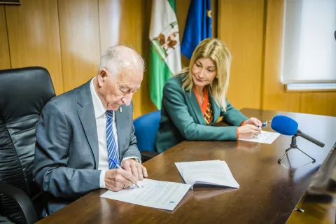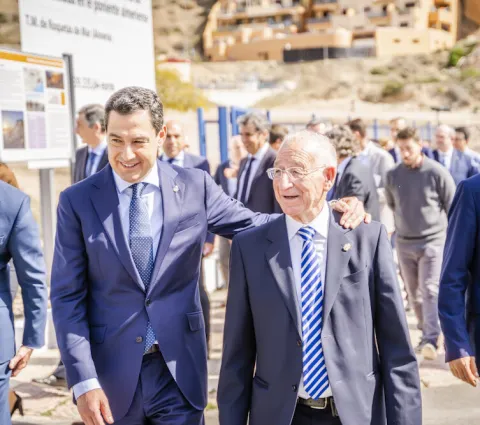 Juanma Moreno y Gabriel Amat han colocado la primera piedra de las obras de conexión de agua desalada en Roquetas de Mar