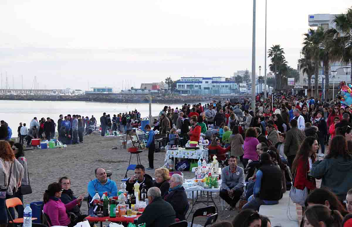 Cuando empieza a caer la tarde y las ascuas se templan es tradición que entre los grupos de amigos y peñas se tiznen la cara unos a otros con ceniza. Es un símbolo inequívoco de que se ha disfrutado de un buen día de Moragas. Con esta fiesta Roquetas de Mar estrecha su vinculación con el mar gracias a una jornada que se vive con alegría e ilusión.