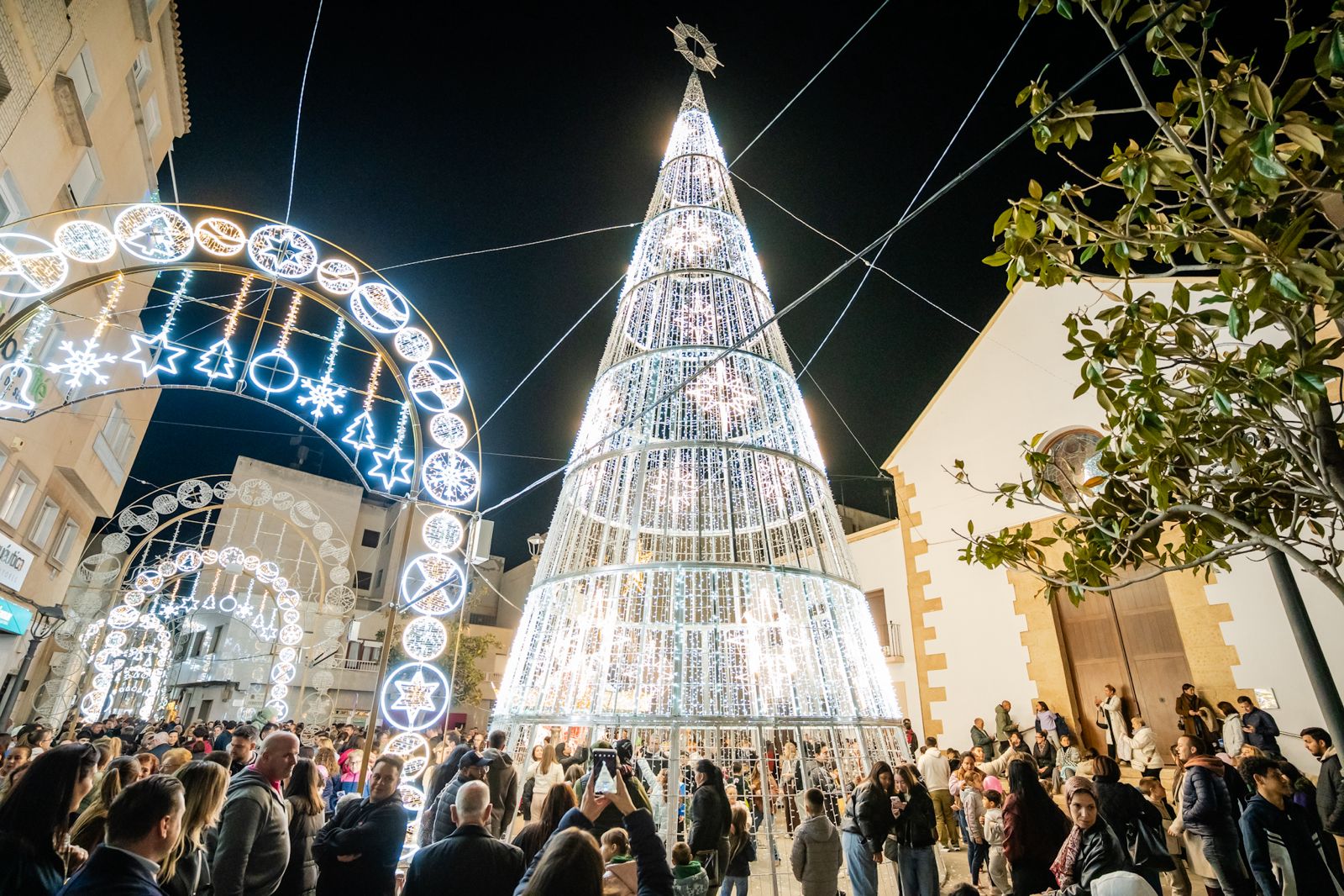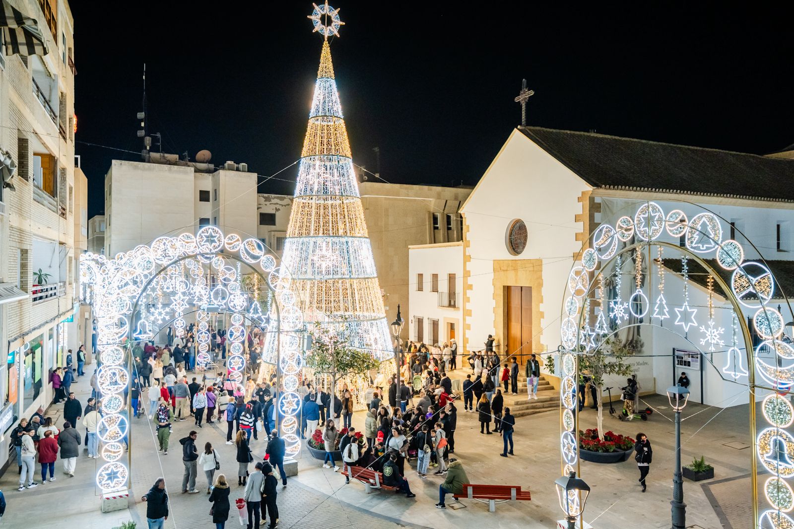 Este año se han instalado cerca de 400 arcos luminosos y 950 palmeras iluminadas, alcanzando un total de tres millones de puntos LED de bajo consumo en todo el municipio. La Plaza de la Constitución incorpora como novedades un gran árbol de Navidad transitable de 20 metros, un tiovivo interactivo de 5×5 metros y un carruaje iluminado con dos caballos, elementos que se han convertido en los principales atractivos para las familias. También se han añadido nuevos motivos tridimensionales y once árboles navideños distribuidos en distintos espacios, mientras que los 19 pórticos del entorno del Ayuntamiento continúan ofreciendo cada día juegos de luz y sonido. El faro ornamental de 25 metros, ya tradicional en el alumbrado roquetero, vuelve a formar parte del conjunto luminoso con su espectáculo de luz y sonido característico.