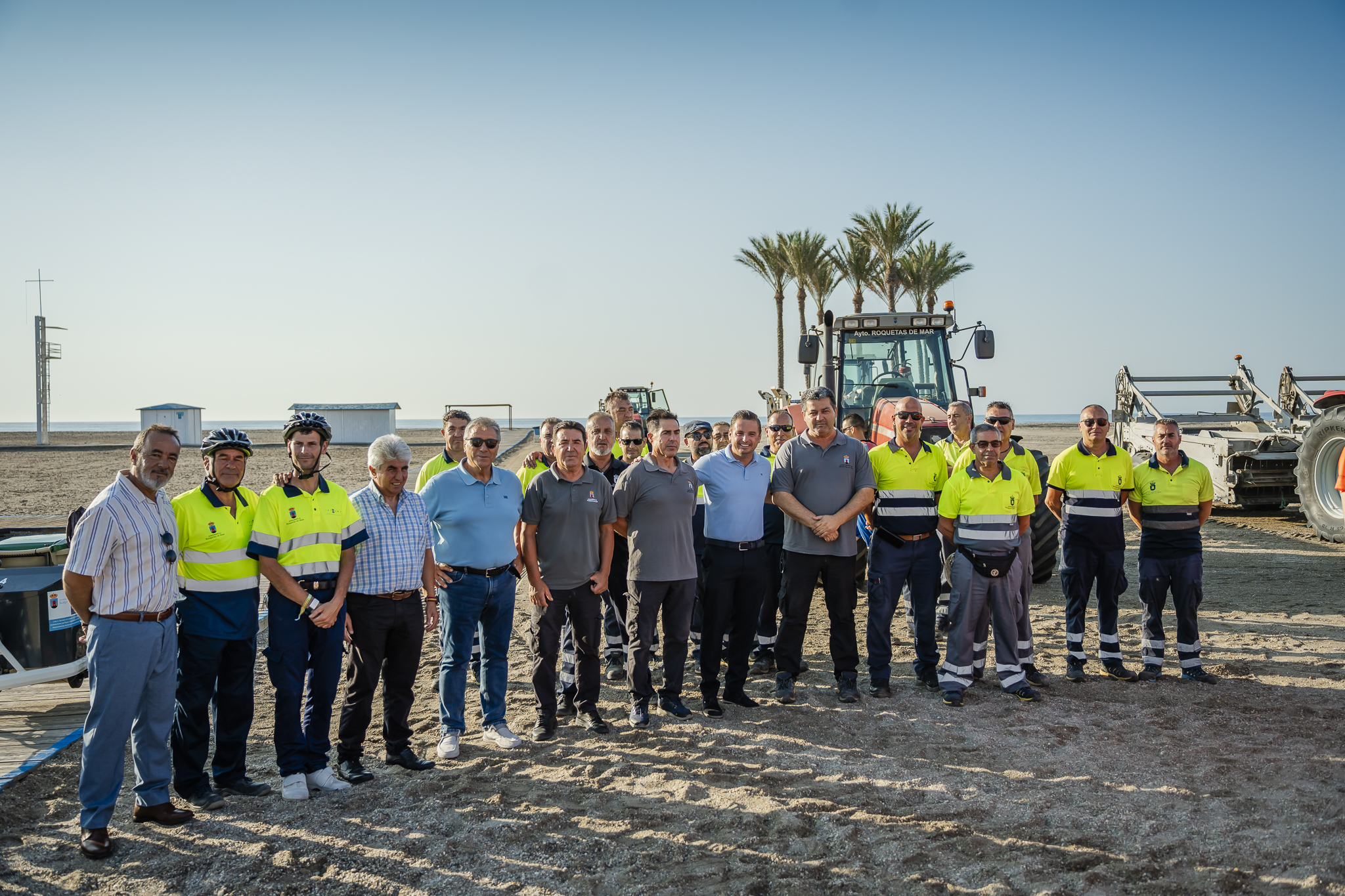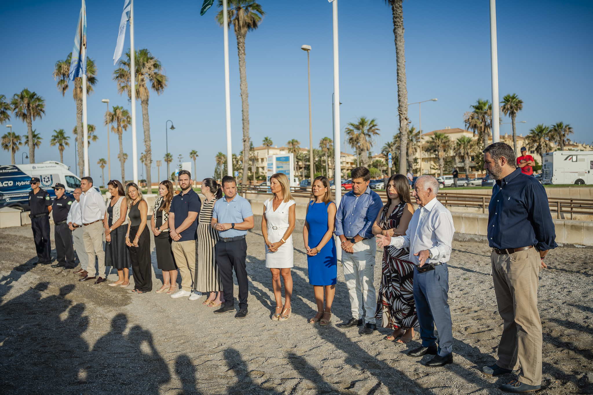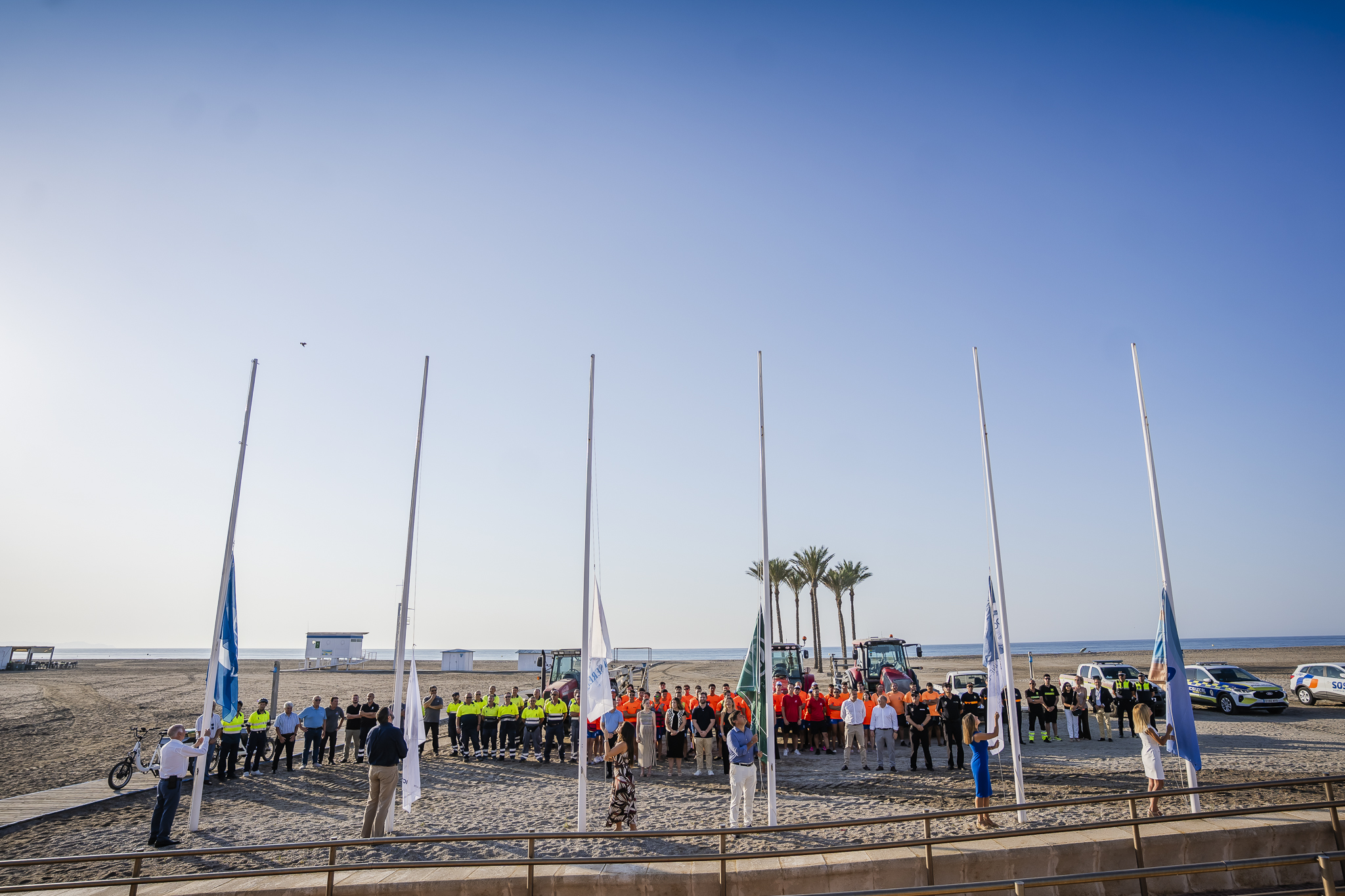 El alcalde de Roquetas de Mar, Gabriel Amat, acompañado por todos los concejales del equipo de gobierno, junto con el delegado de Turismo, Cultura y Deportes de la Junta de Andalucía en Almería, Juan José Alonso, han participado en este acto en el que también han estado presentes agentes de Policía Local, operarios de playas y miembros de Protección Civil.