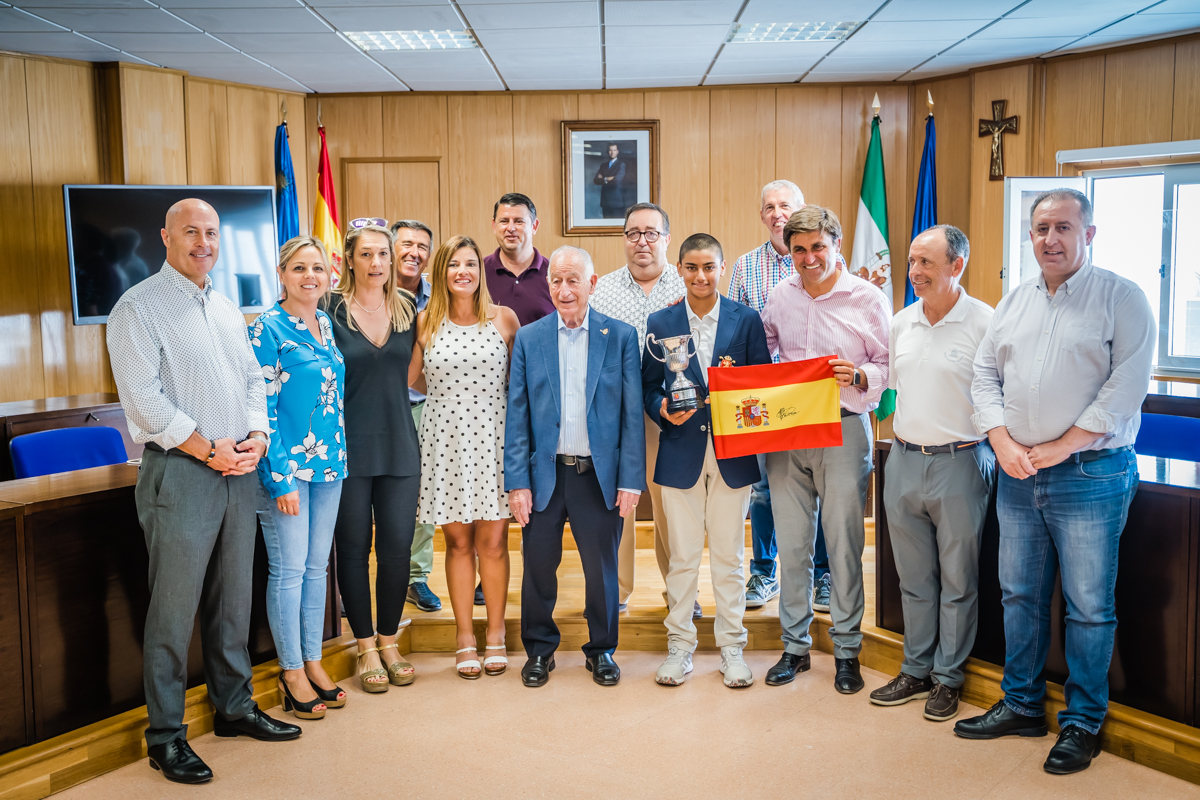 El alcalde de Roquetas de Mar, Gabriel Amat, acompañado por el concejal de Deportes y Tiempo Libre, José Juan Rubí y otros miembros del equipo de Gobierno, ha recibido en el salón de plenos del Ayuntamiento al joven deportista roquetero, Arián Rodríguez, proclamado recientemente Campeón de España Infantil de Golf.