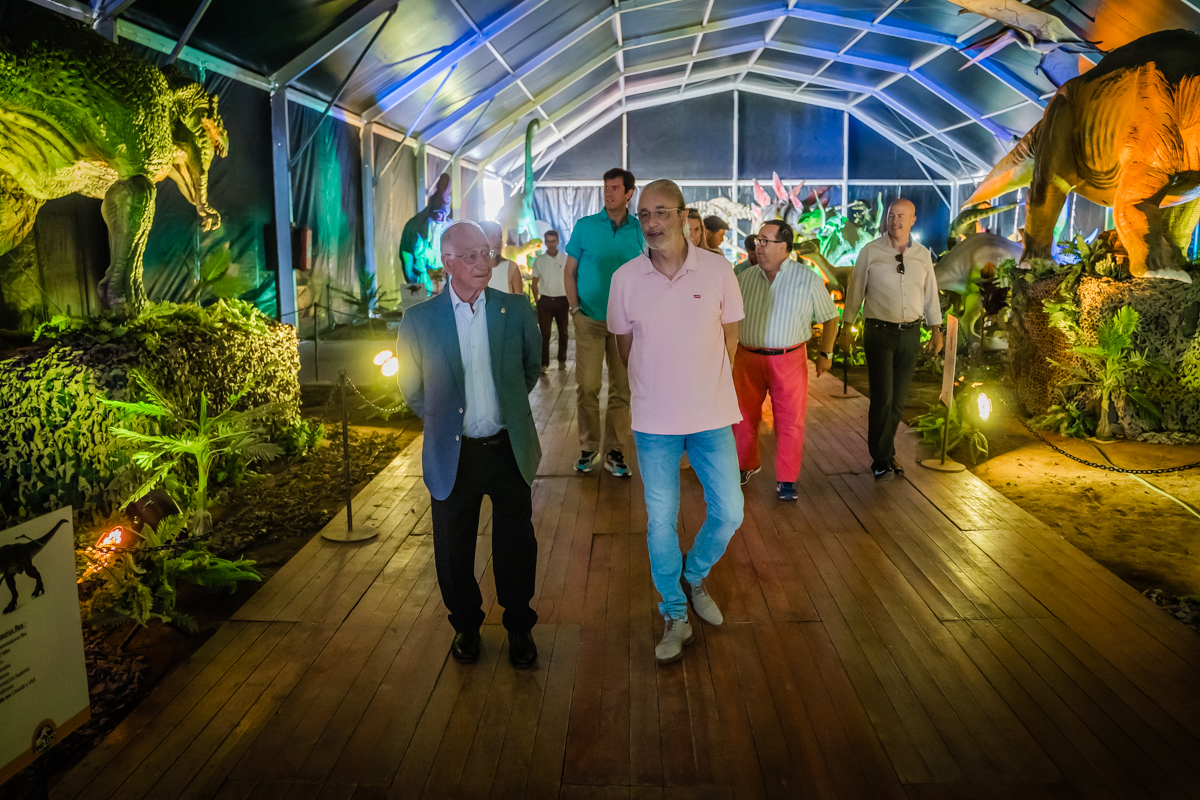 El alcalde de Roquetas de Mar, Gabriel Amat, acompañado por los concejales de Educación, Cultura y Juventud, Juanjo Salvador y el concejal de Deportes y Tiempo Libre, Juan José Rubí, junto con otros miembros del equipo de Gobierno, ha inaugurado Expo Dino XXL, una muestra al aire libre que acoge a más 100 dinosaurios mecanizados.