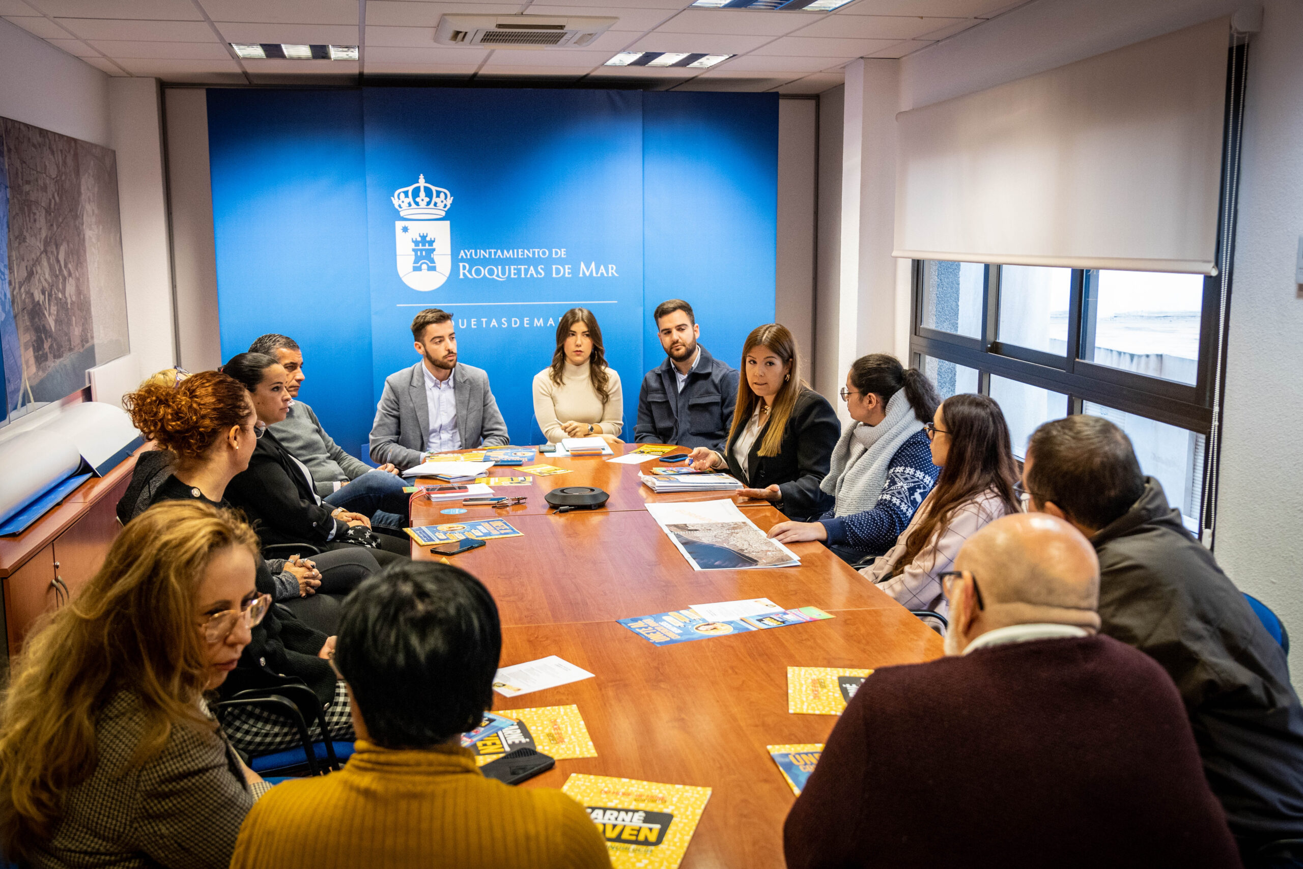 La concejal de Comercio, Amalia López junto con el concejal de Juventud, Juan Carlos Muyor y el responsable del Instituto Andaluz de Juventud en Almería, Diego Martínez, han mantenido un encuentro con los representantes de las asociaciones de comerciantes de Roquetas de Mar para informarles sobre esta iniciativa.