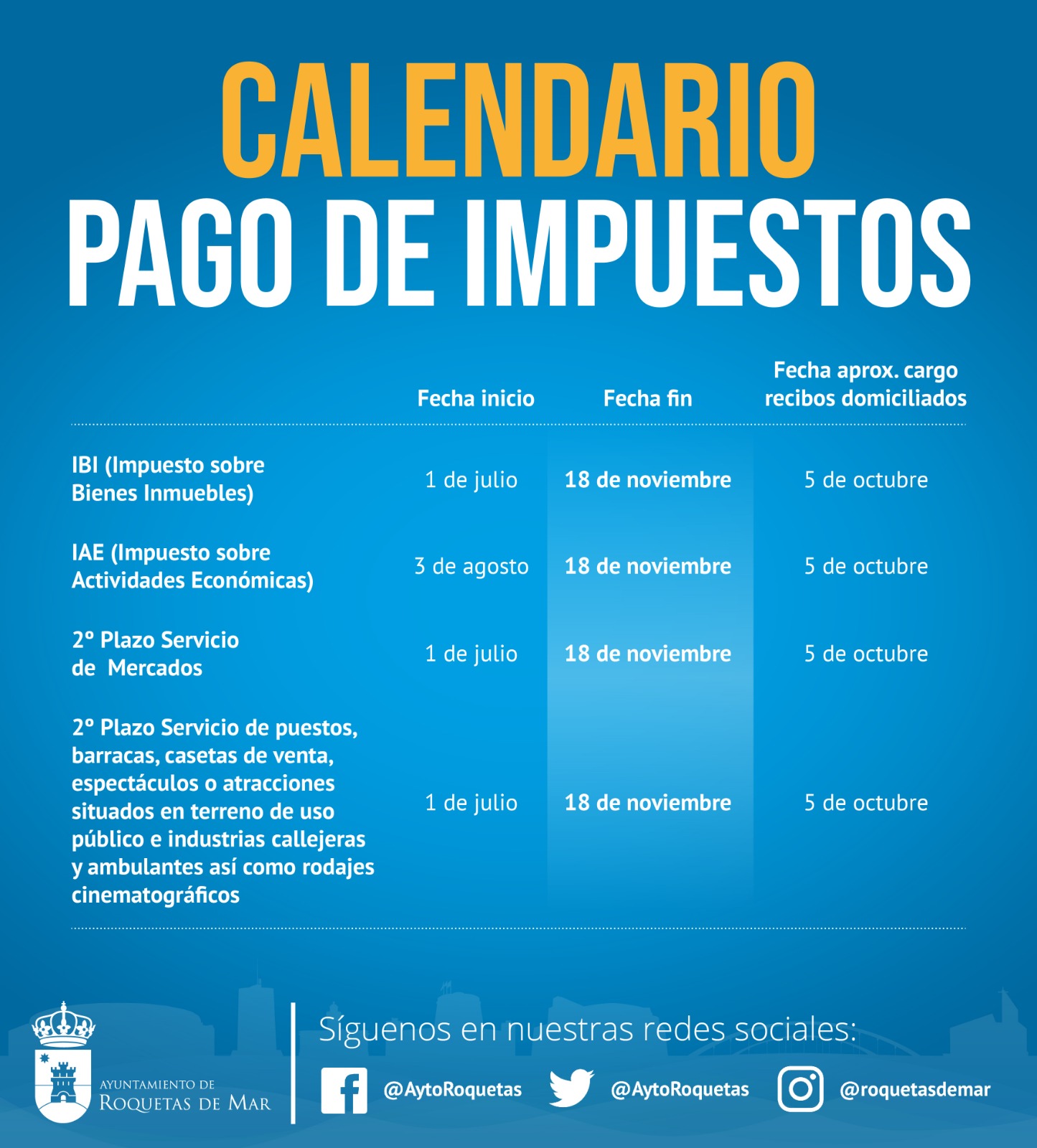 En lo que respecta al Impuesto de Actividades Económicas, el periodo establecido es desde el 3 de agosto al 18 de noviembre con fecha aproximada de cargo en cuenta en recibos domiciliados el 5 de octubre.