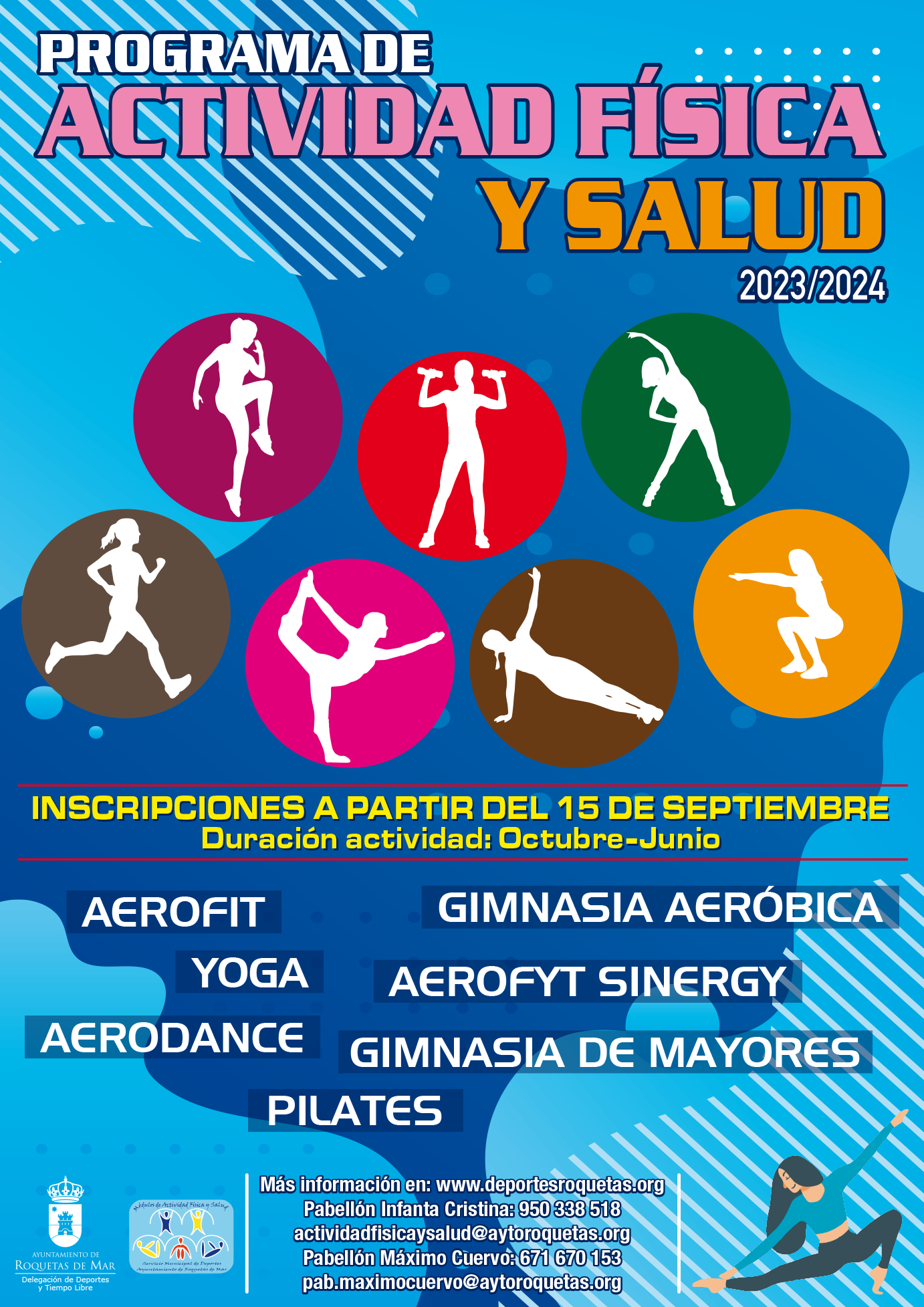 El área de Deportes y Tiempo Libre ha puesto en marcha el programa de Actividad Física y Salud 2023/2024, que se desarrollará de octubre a junio.  Las nuevas inscripciones para alguna de las siete actividades se pueden realizar en los Pabellones Infanta Cristina y Máximo Cuervo de 09:00 a 14:00 horas y los IDM Las Marinas y Eva Lara de 09:00 a 12:00 horas a partir del 15 de septiembre. Las actividades son pilates, yoga, aerodance, aerofit, gimnasia aeróbica, gimnasia de mantenimiento y gimnasia de mayores. Todos los módulos incluidos los de mayores se impartirán desde 3 de octubre a 30 de junio ambos inclusive.