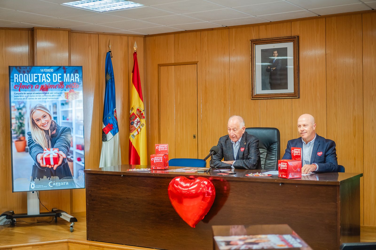 El alcalde de Roquetas de Mar, Gabriel Amat, junto al concejal de Comercio, Antonio López, han presentado esta campaña que arranca la próxima semana y llevará a cabo hasta el 14 de febrero, día de San Valentín, con el fin de que todas aquellas personas que quieran comprar sus regalos a sus seres queridos con motivo del día de San Valentín lo hagan en los pequeños y medianos comercios de la ciudad.