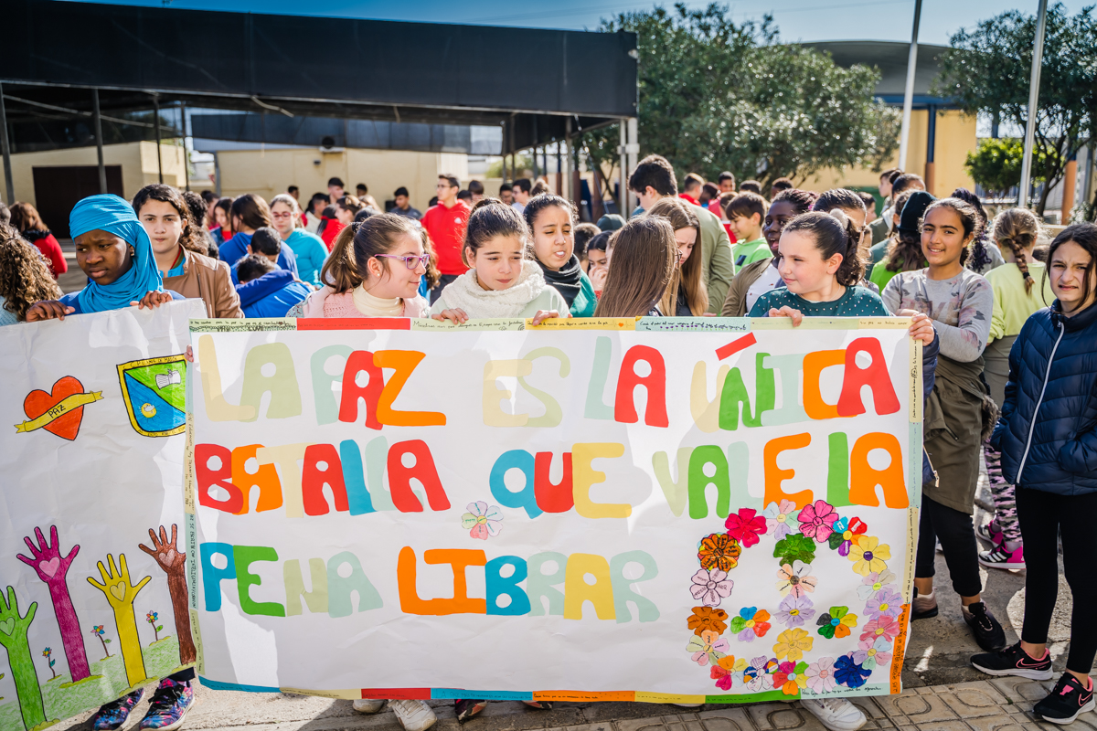 Durante la marcha, cada clase iba encabezada por un cartel diseñado por los propios alumnos y en el que se podían leer mensajes como “La Paz es la única batalla que vale la pena librar” o la palabra escrita en diferentes idiomas. En el recorrido hasta la plaza, donde se ha leído el manifiesto por la paz, se han escuchado canciones para la ocasión.