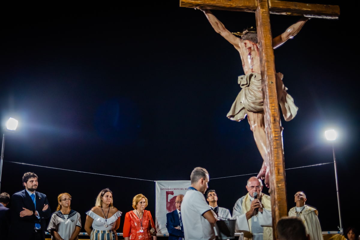Bajada del Cristo a hombrosUna vez frente al faro, la luna fue testigo de las costaleras bajando al Crucificado y colocándolo directamente sobre sus hombros y bajándolo en zigzag hasta el paseo, frente al mar. Allí, el párroco Javier Yepes fue el primero en lavarle los pies al Señor con el agua que, previamente, había bendecido el sacerdote Ginés García. Después, fue el turno de la madrina, María Pintor, el alcalde de Roquetas de Mar, Gabriel Amat, el sacerdote Ginés García, el concejal coordinador del Área de Desarrollo Urbano, Francisco Gutiérrez, el jefe de protocolo del Ayuntamiento, José Fernández Terol y, finalmente, Isabel María Pérez Martín.