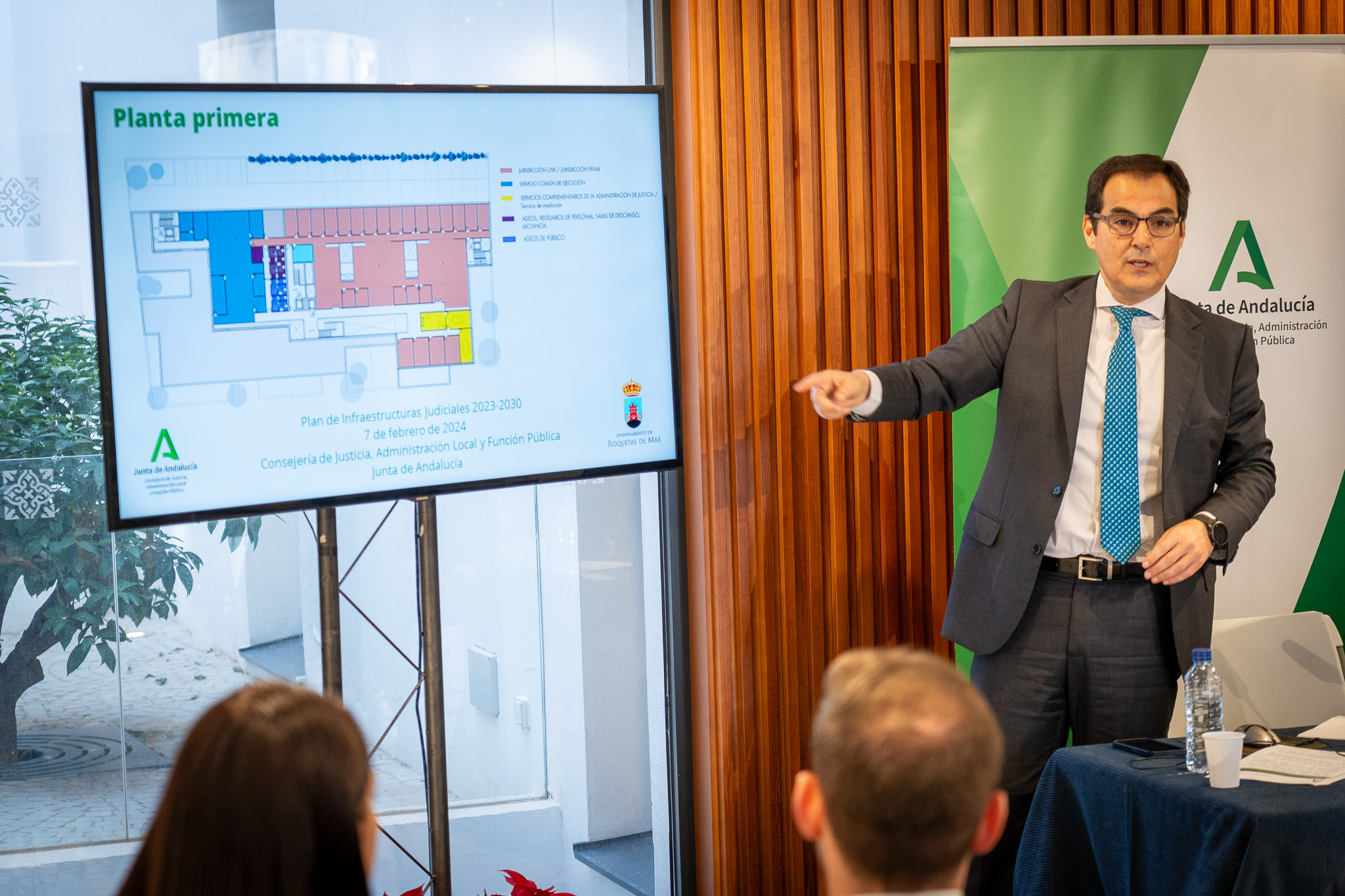 El consejero de Justicia, Administración Local y Función Pública, José Antonio Nieto, y el alcalde de Roquetas de Mar, Gabriel Amat, han presentado hoy el proyecto del nuevo Complejo Judicial de la localidad almeriense, pionero en la colaboración público-pública para su ejecución y que, con más de 6.000 m², será el “modelo” para la red de sedes en ciudades medias de más de 100.000 habitantes previstas en el Plan de Infraestructuras Judiciales 2023-2030. Así, la distribución de los espacios se adecuará al nuevo modelo de Oficina Judicial e incluirá nuevos servicios como salas de lactancia, de descanso, vestuarios o estancias para mediación.