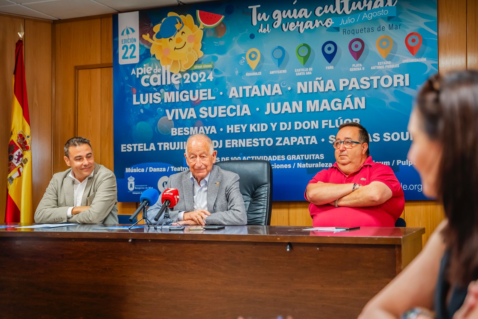 El alcalde de Roquetas de Mar, Gabriel Amat, acompañado por el concejal de Cultura, Daniel Salcedo y el concejal de Deportes y Tiempo Libre, Jose Juan Rubí, ha presentado A Pie de Calle 2024, uno de los programas más destacados de este municipio durante el verano debido al importante aumento de visitantes y turistas que escogen Roquetas de Mar para pasar sus vacaciones.