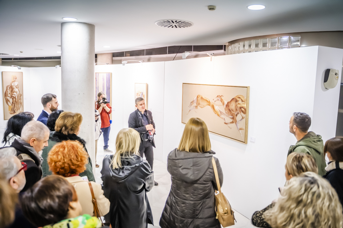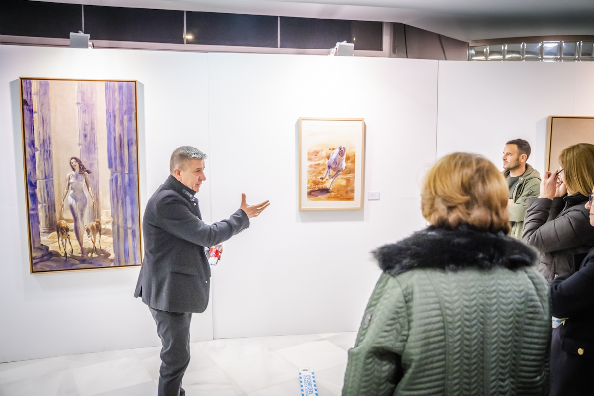 José Antonio García Amezcua agradeció al Ayuntamiento de Roquetas de Mar por dar la oportunidad de mostrar esta serie en el Teatro Auditorio, una lugar emblemático del municipio y explicaba que “los galgos parece que han cogido sitio en Roquetas. En el año 2006 comencé la serie de los galgos y me sigue acompañando hasta hoy día. Me motiva la figura del galgo para transmitir a través de él una serie de sentimientos”.