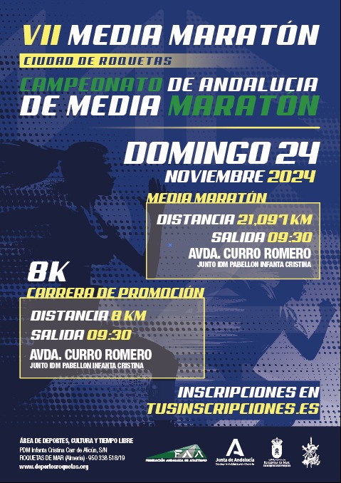El próximo 24 de noviembre a las 9:30 horas, Roquetas de Mar será el escenario de la ‘VII Media Maratón Ciudad de Roquetas’ y del ‘Campeonato de Andalucía de Media Maratón’ 2024. Estas dos pruebas principales abarcarán un recorrido de 21.097 metros y coincidirán con una novedad este año: una carrera de promoción de 8K (8.000 metros). Todas las pruebas se desarrollarán en un circuito urbano homologado y totalmente llano, con inicio en la Avenida Curro Romero y meta en el ruedo de la Plaza de Toros de Roquetas de Mar.