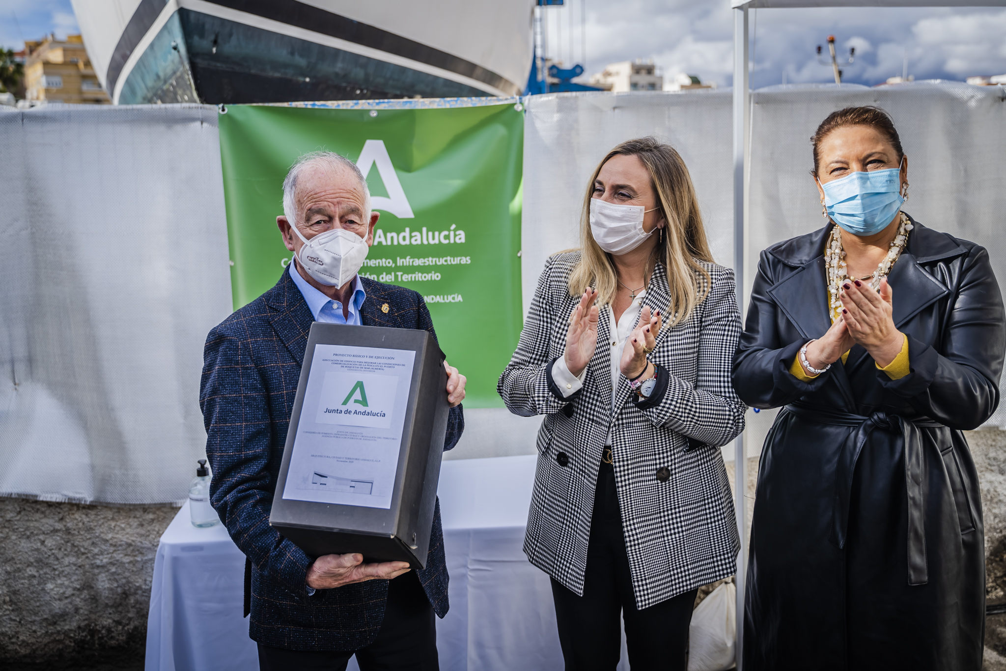 Las consejeras de Fomento, Infraestructuras y Ordenación del Territorio, Marifrán Carazo, y de Agricultura, Ganadería, Pesca y Desarrollo Sostenible, Carmen Crespo, han presentado hoy al alcalde de Roquetas de Mar, Gabriel Amat, el proyecto de la nueva lonja del puerto pesquero de la localidad y la reurbanización de la zona. Las obras se licitarán antes de final de año y, una vez adjudicadas, se ejecutarán en 14 meses.