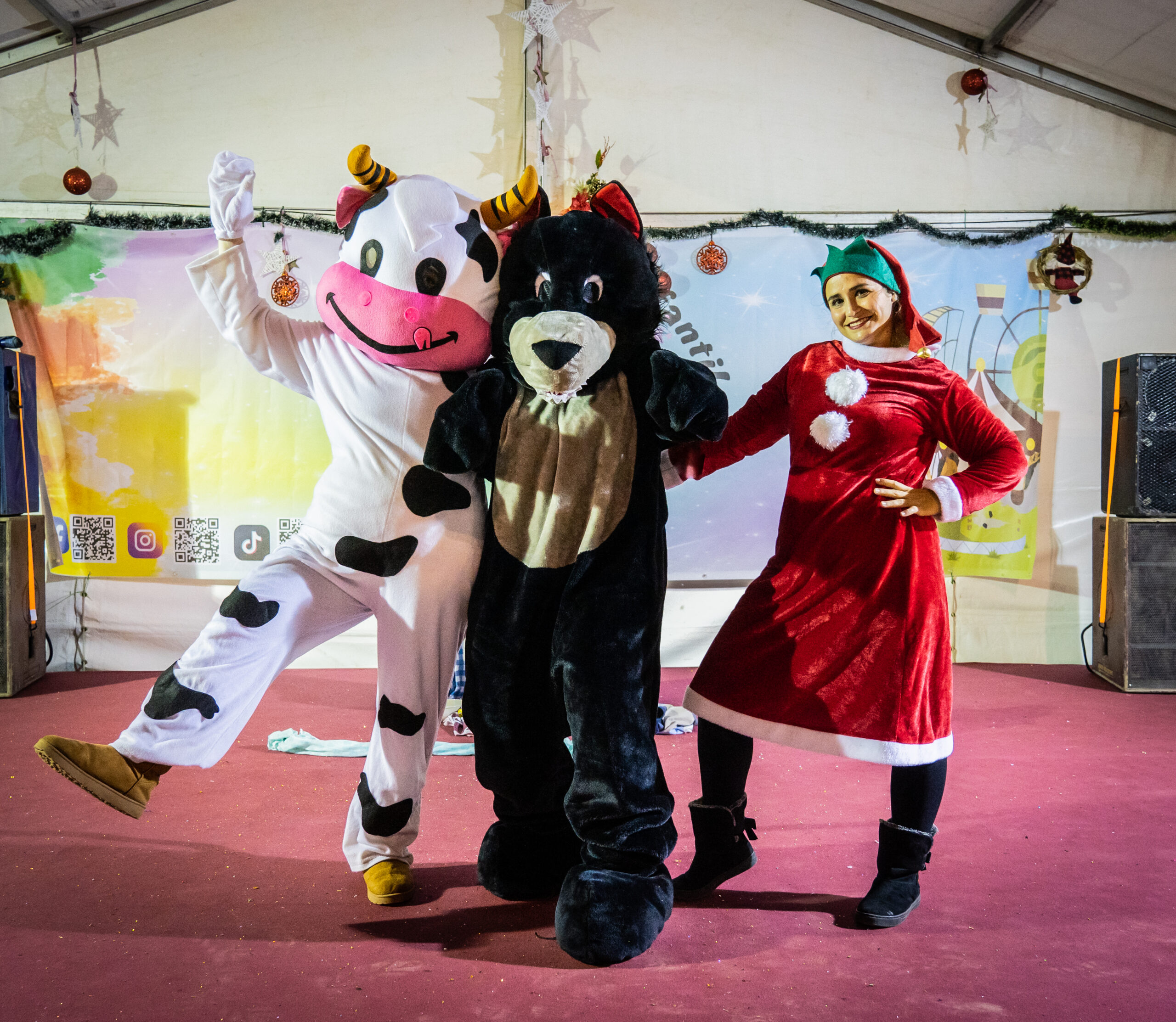 Una locutora junto a dos actores caracterizados como un lobo y una vaca han ofrecido a los pequeños asistentes un teatro interactivo en el que los más pequeños han participado durante todo el cuento. La temática de los dos animales y una cola perdida de uno de ellos ha entusiasmado a los niños, que no han podido contener risas y aplausos a lo largo de la actuación.
