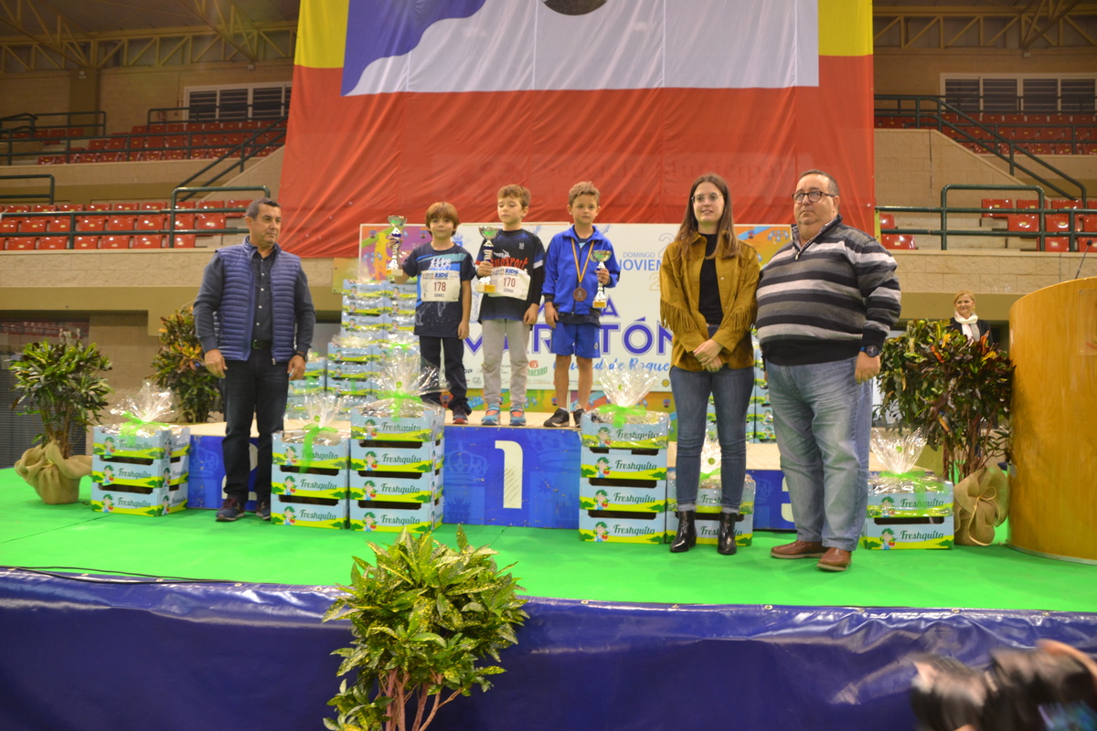 La categoría prebenjamín ha sido quizá la más concurrida, con los corredores nacidos en los años 2012-2013. En este caso, se ha alzado con la copa masculina de ganador el corredor Sergio González Gómez, del CD Galosport, seguido de Daniel Belmonte González y de José María Juárez Casado de Amezúa, del colegio Altaduna-Saladares. En femenino, la ganadora ha sido Alejandra González Moreno, del Real Club Náutico de Roquetas de Mar, mientras que Ainhoa Rodríguez Abbnante y Ángela García Amador se han hecho con el segundo y tercer puesto.