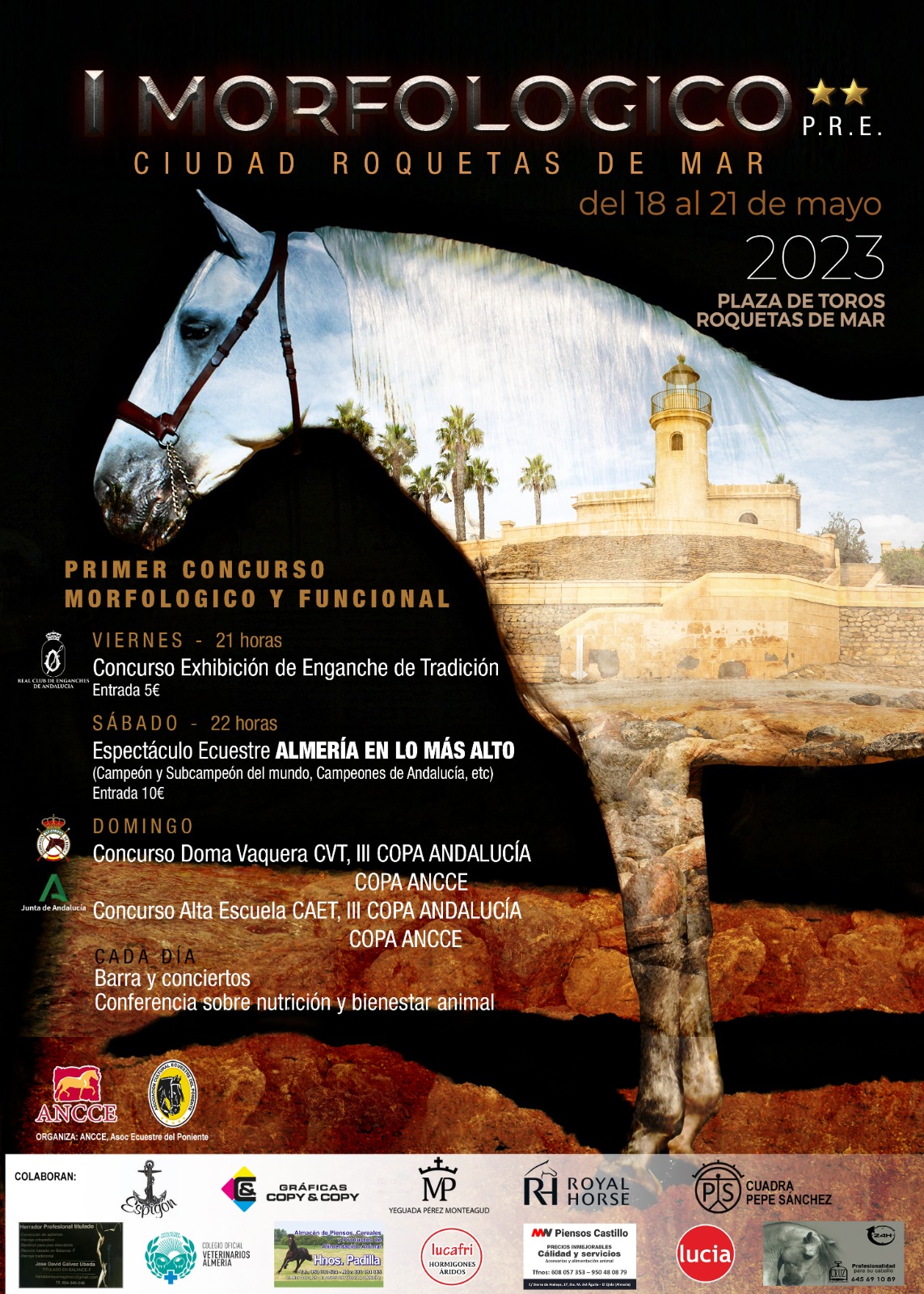 Roquetas de Mar acoge la próxima semana el I Concurso morfológico y funcional de Pura Raza Española categoría 2, enganche tradicional, doma vaquera y alta escuela Villa de Roquetas de Mar. Tendrá lugar en la Plaza de Toros y en el Parque de los Bajos y alrededores. Esta importante cita equina comienza con la recepción de los ejemplares participantes el jueves 18 de mayo. Al día siguiente comienza el concurso, que se celebra en sesiones de mañana y tarde, además habrá conferencias veterinarias, la fase A de la presentación de enganches de coches de tradición y la fase B de manejabilidad, con exhibición de enganches de tradición. El sábado continúa el concurso de 9.30 a 14.00 y de 16.00 a 20.30 horas y habrá un espectáculo ecuestre bajo el título de ‘Almería en lo más alto’. El último día se celebra la última parte del concurso y se procederá a la entrega de los premios especiales a las 11.30 horas. A las 12.00 tendrá lugar el territorial de Alta Escuela Española y el de Doma Vaquera. Todas las jornadas finalizan con conciertos flamencos a las 00:00 horas.