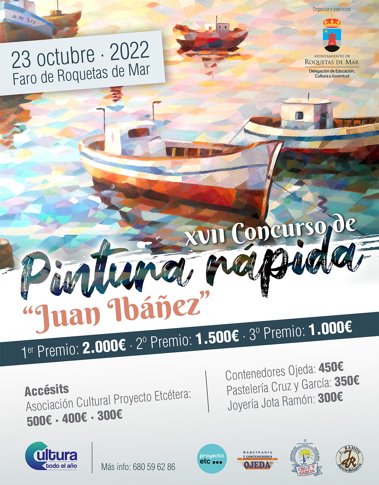Este domingo, 23 de octubre se celebra el XVII Concurso de pintura rápida ‘Juan Ibáñez’ en el que podrán participar todos los pintores que lo deseen. El tema será ‘Roquetas de Mar y su entorno’. La técnica será libre y el soporte será lienzo, papel o tabla, de 50 x 50 centímetros mínimo y 116 x 116 centímetros máximo. Los cuadros vendrán provistos de un listón de 3 centímetros de ancho mínimo o, en su defecto, se pintarán los cantos del soporte. En caso de tratarse de papel, deberá ir acompañado de un soporte rígido.