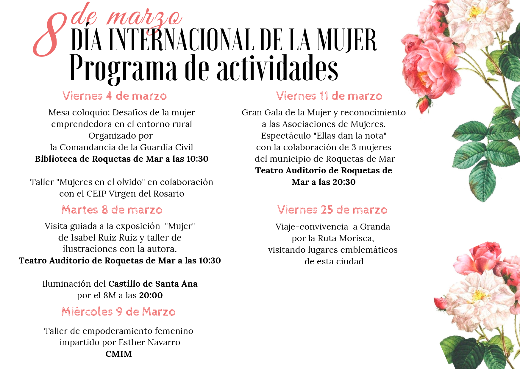 El Ayuntamiento de Roquetas de Mar, a través de la concejalía de la Mujer, ha organizado un amplio programa de actividades que se llevarán a cabo durante todo el mes de marzo, con motivo del Día Internacional de la Mujer, que se conmemora el 8 de marzo.