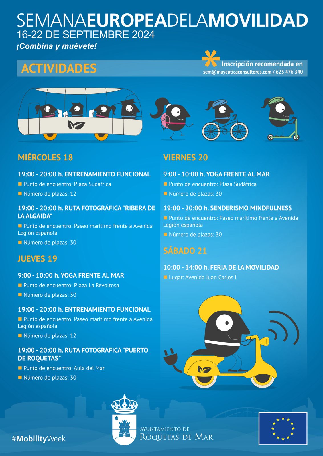 El Ayuntamiento de Roquetas de Mar, a través la concejalía de Movilidad y Tráfico, ha organizado una amplia programación de actividades con motivo de la Semana Europea de la Movilidad que se celebrará desde el 16 hasta el próximo 22 de septiembre. Este año, el tema elegido es el tema elegido por la Comisión Europea para la campaña de este año 2024 es “Espacio Público Compartido”, mientras que el lema de la iniciativa sigue siendo "¡Combina y muévete!". En concreto, se pretende poner el foco en los beneficios que los espacios públicos aportan a la sociedad como lugares idóneos para la convivencia entre las personas, las distintas modalidades de transporte y la realización de actividades con más equidad social, menos ruido y contaminación del aire y una mejora de la calidad de vida.
