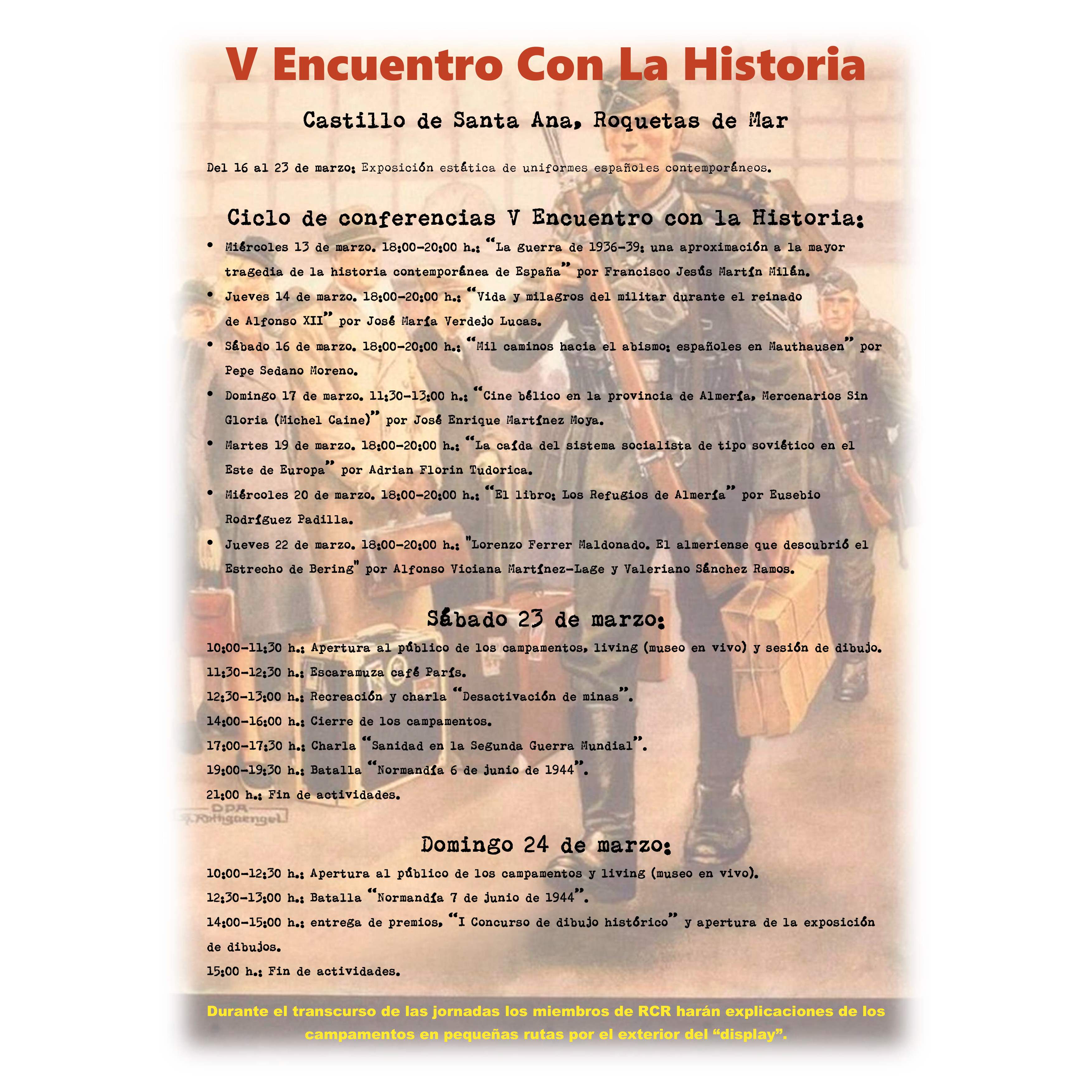 Roquetas de Mar celebra el V Encuentro con la historia que organiza la Asociación de Recreación y Coleccionismo Histórico Militar de Roquetas de Mar junto al consistorio roquetero. Desde este miércoles se llevarán a cabo un ciclo de conferencias y el colofón será los días 23 y 24 con la Recreación de la Batalla de Normandía en el Castillo de Santa Ana.