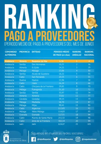 El Ayuntamiento de Roquetas de Mar, entidad más rápida de toda Andalucía en el pago a proveedores