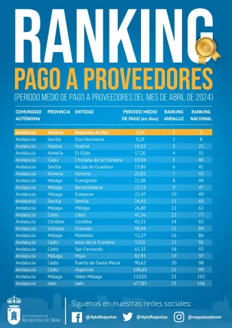 El Ayuntamiento de Roquetas de Mar, primera entidad municipal de Andalucía en el pago a proveedores